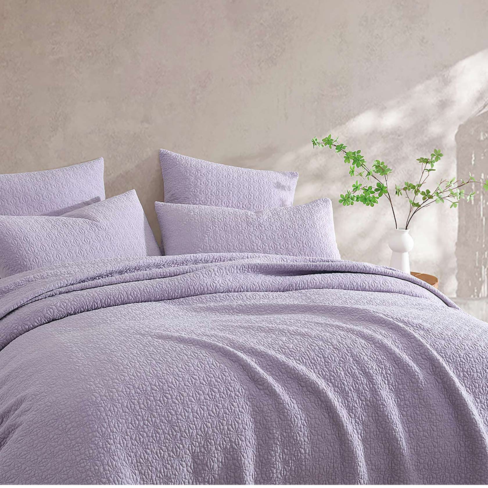 Smart and tailored, Kayo is a nod to contemporary design. Stitching in an intricate geometric design and stonewashed to create a textural organic aesthetic. This coverlet set will be the perfect addition to any bedroom styling. This core coverlet has been revitalised for spring and summer in colours of fog and lilac.