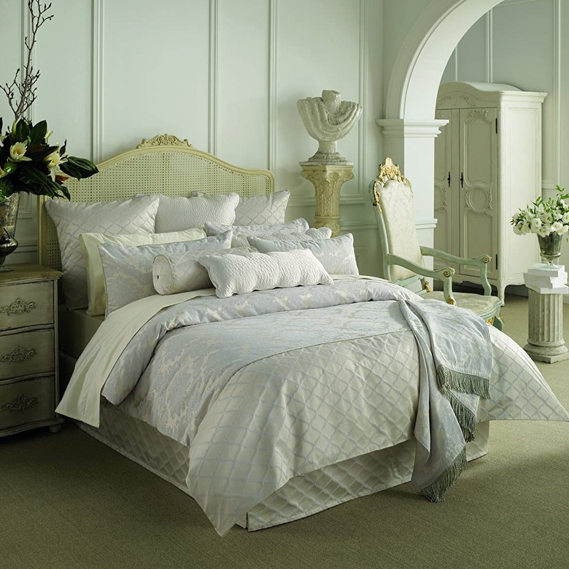 - At the foot of the bed a contrasting diamond pattern is joined with silver rope piping