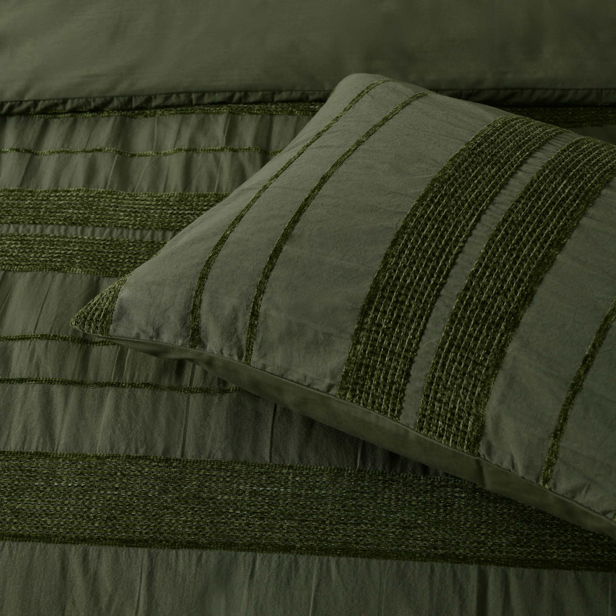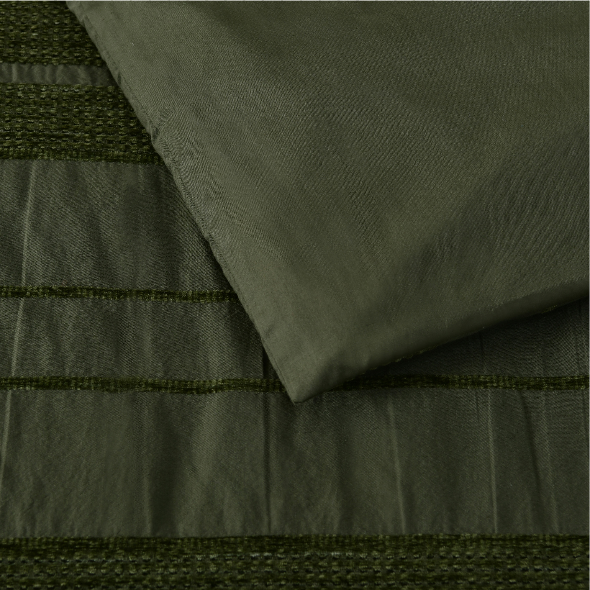 Avery is made from a beautiful easy-care polyester/cotton fabric. The popular forest green colourway is further complimented by horizontal polyester chenille stripes, which are super soft to touch. Add the matching european pillowcases and cushion to complete the look.