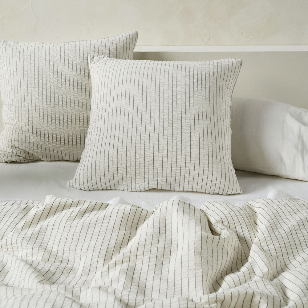 This set is finished with cord piping trims in matching fabric, reverses to a plain-dyed cotton, and looks even more inviting paired with coordinating European pillowcases.