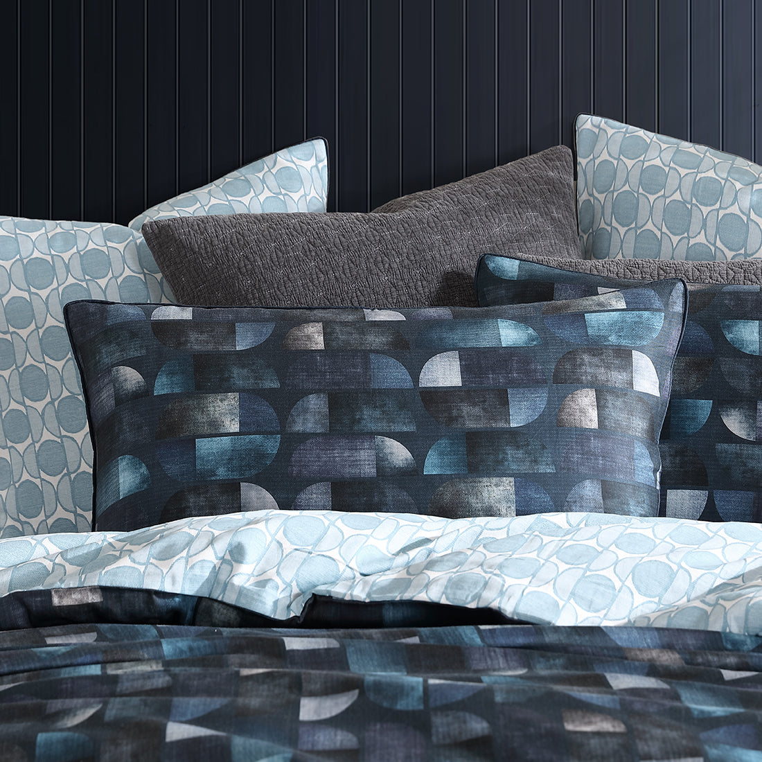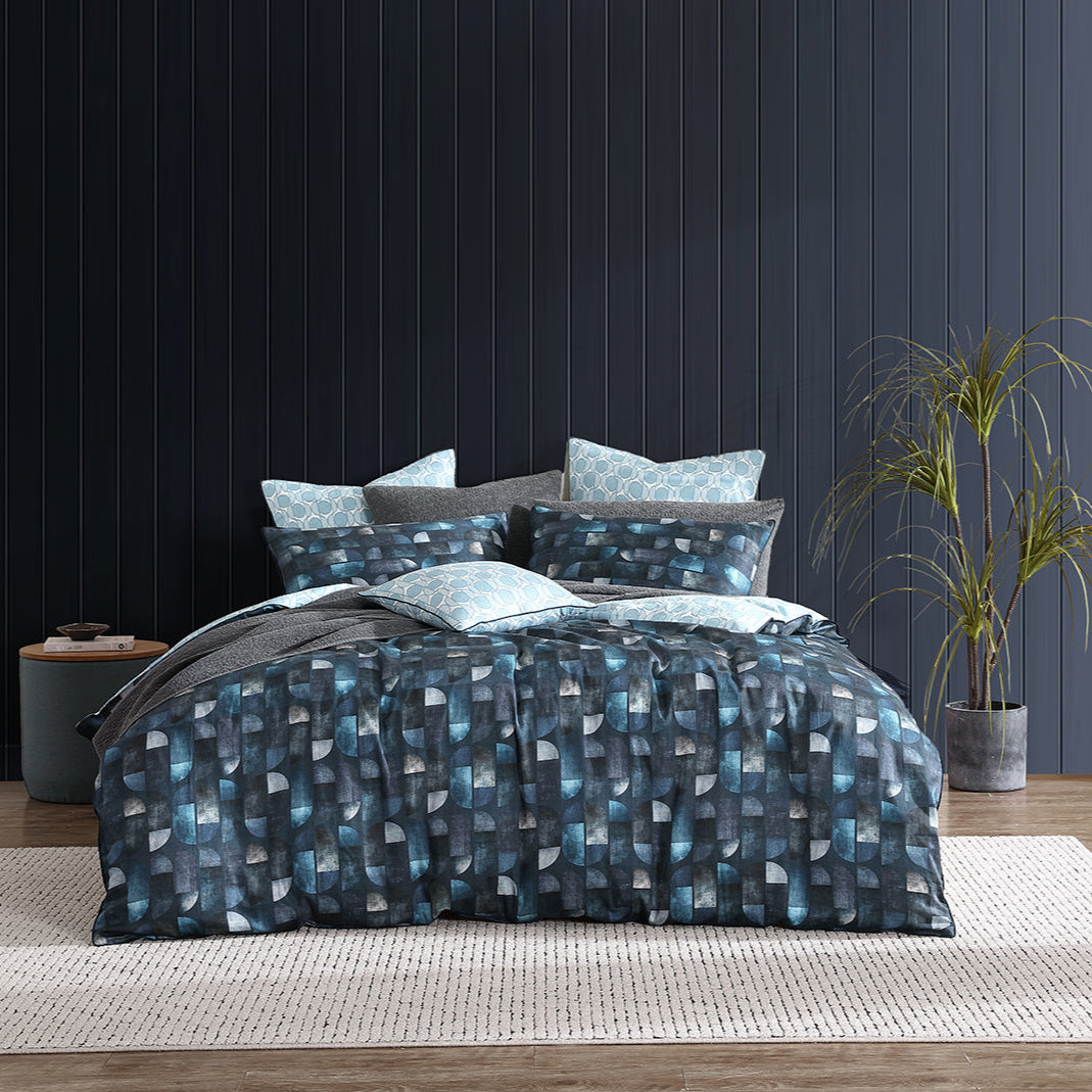 Introducing the Keanu quilt cover set, a blend of masculine sophistication and modern design. Featuring textured oval shapes in a spectrum of tonal indigo blues, this quilt cover set exudes a strong, stylish presence. The linen texture background adds an organic touch, enhancing the overall depth and dimension. On the reverse side, a soft tonal geometric print in complementary blues and white offers a subtle yet sophisticated contrast. Perfect for creating a contemporary retreat, the Keanu quilt cover set combines elegance and comfort with a modern edge.