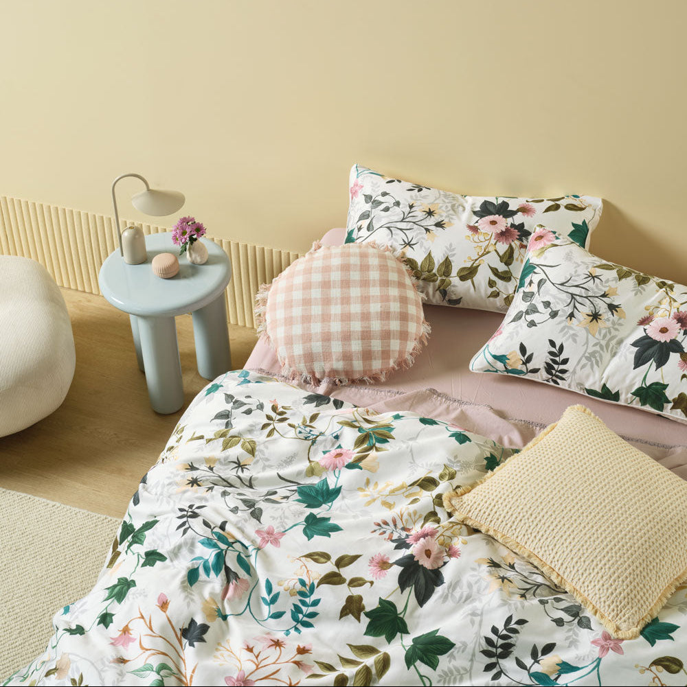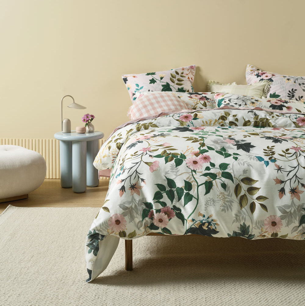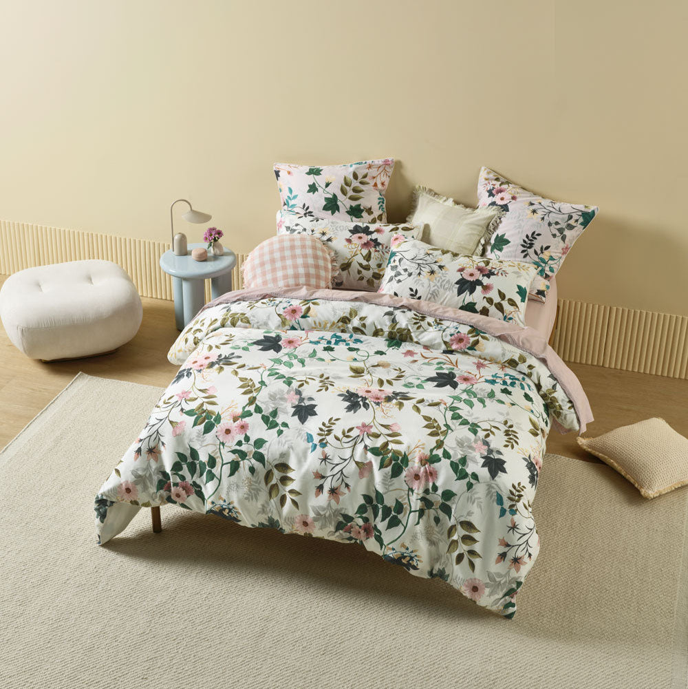 Luxuriate in cascading vines and leaves printed on a white cotton sateen ground, in varied pinks, blues, greens and taupe, complete with a cord piping trim.