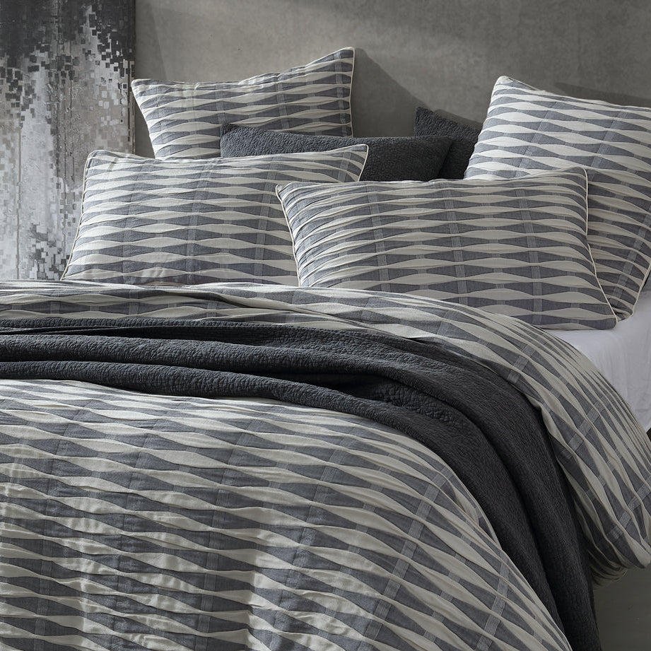 Kirby is a quilt cover set that commands attention with its oversized shapes and bold colour contrasts. Featuring large honeycomb patterns in warm stone and stark charcoal, it creates a striking graphic effect. The interplay of horizontal and vertical stripes is further emphasized by the arrangement of pillows and accessories, adding depth to the quilt cover. A modern corded piped edge completes the look with a contemporary touch, making Kirby a standout addition to your bedroom.