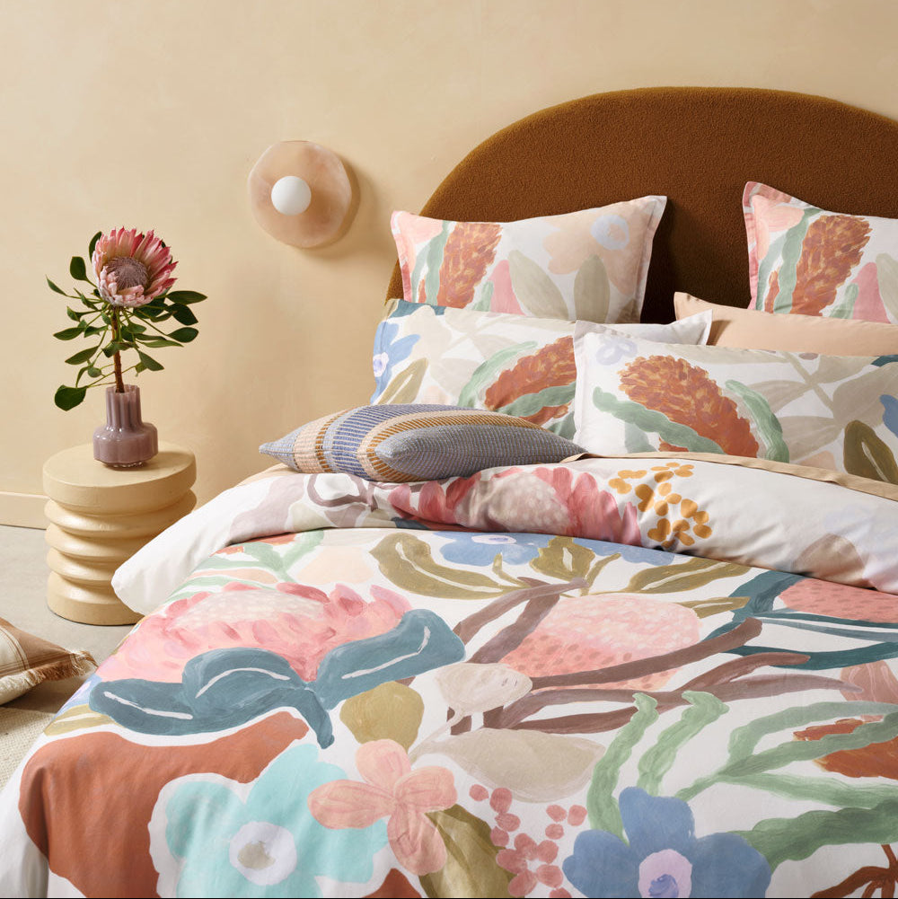 This large-scale ensemble of banksias and proteas is depicted in warm hues of clay, saffron, hazelnut and ginger, and looks even more alluring styled with its matching European pillowcases.