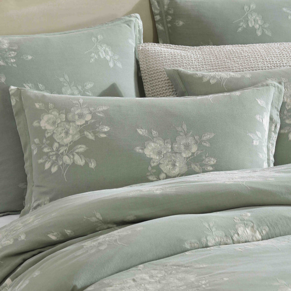 The Maisey quilt cover set exudes delicate romance with its intricate jacquard floral design. Stonewashed for a vintage appeal, this set offers a soft, textured finish. The subtle yet elegant self-tailored flange is beautifully bordered by matte herringbone tape, adding a refined touch to the overall design.
