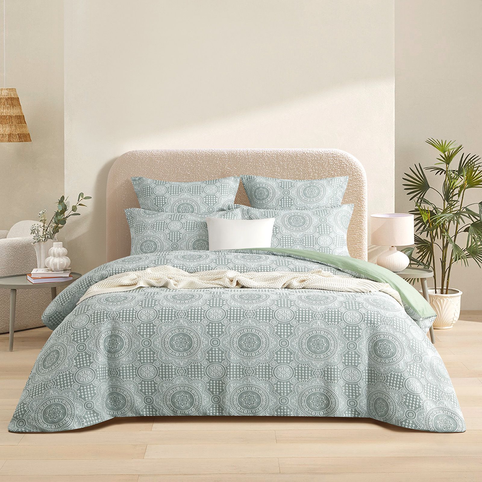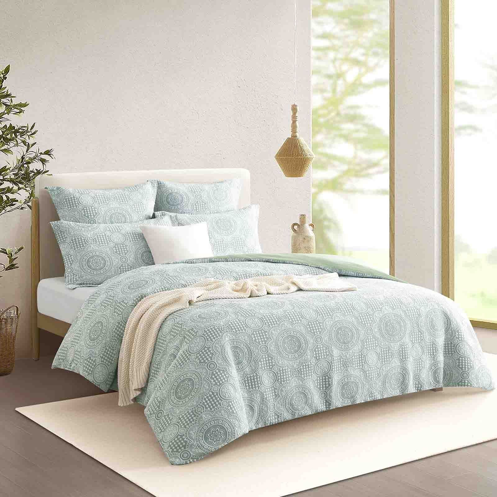 This quilt cover set, crafted from a cotton blend jacquard weave and inspired by the beloved boho style, exudes timeless elegance and rich texture. It perfectly balances comfort with sophistication. The detailed jacquard pattern merges ethnic and ornamental motifs into a refined mandala tile design, adding depth and charm to your space. Its calming sage hue harmonizes effortlessly with any palette, bringing a serene ambiance to your bedroom. The set includes a quilt cover and matching pillowcases, with European pillowcases available to complete the look.