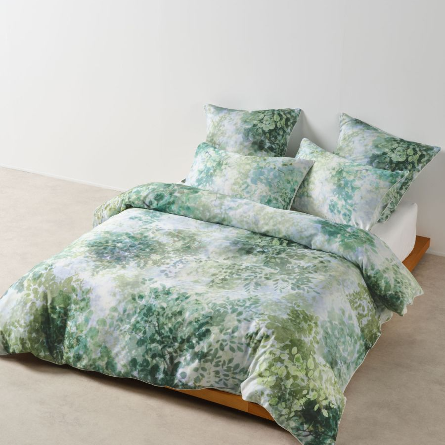 Treetop's array of green and blue invites you to a dream escape: a perfect area of shade to ward off that summer heat. Printed on luxe cotton sateen, this leafy, visual delight is finished with a cord piping trim.
