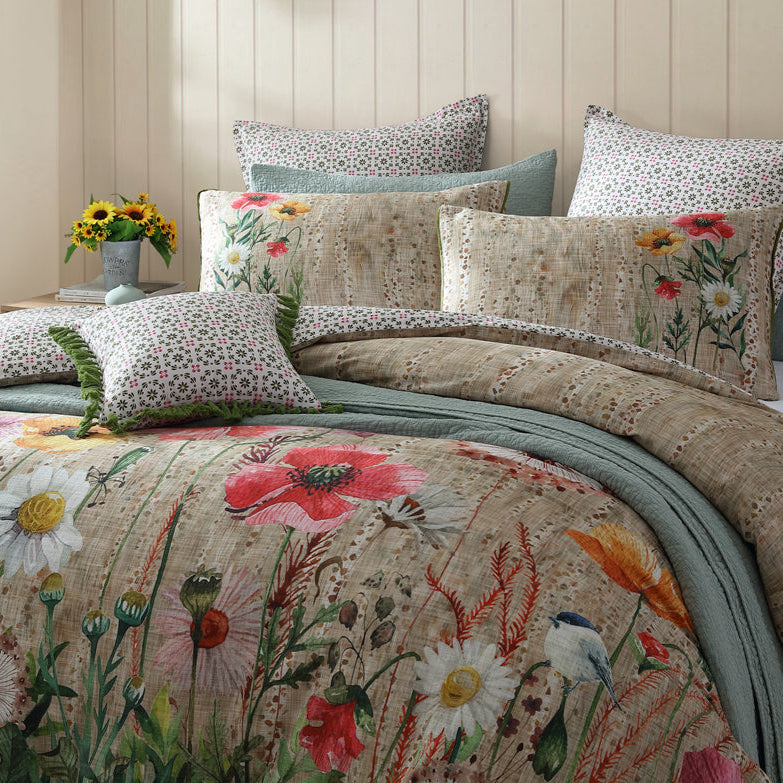 Introducing the Versailles quilt cover set, where opulent artistry meets sophisticated design. This stunning quilt cover set features over-scaled painterly orals, adorned with delicate small birds and butterflies, set against a terrazzo textured background. The vibrant florals create a dynamic, artistic focal point that brings a touch of grandeur and elegance to your bedroom.