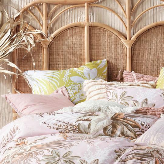 A hand-painted botanical with seventies undertones, Harlow is printed on a soft pink cotton sateen ground with a subtle sheen.