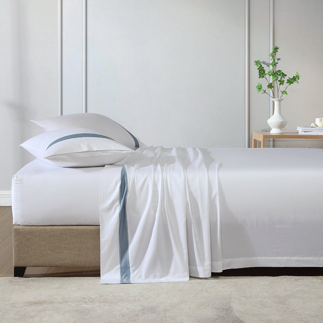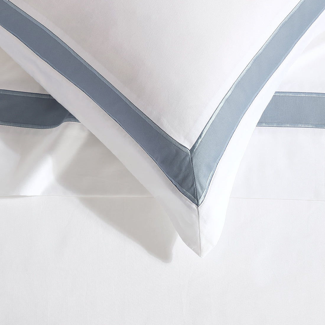 The classic 600 TC cotton sateen is refreshed with the new Bentley design. Crisp white cotton is complemented by modern accents in charcoal, denim, and sage fabric. Elegance is enhanced with tonal embroidered merrow stitching that borders each fabric. Available in both quilt cover and sheet sets, Bentley is the perfect choice for a sophisticated touch.