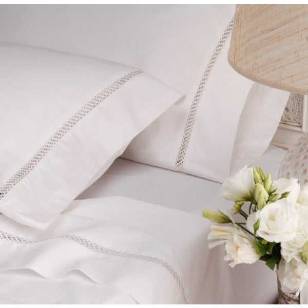 Front - 100% cotton sateen, 400 thread count with decorative guipure white lace insert and oxford edge