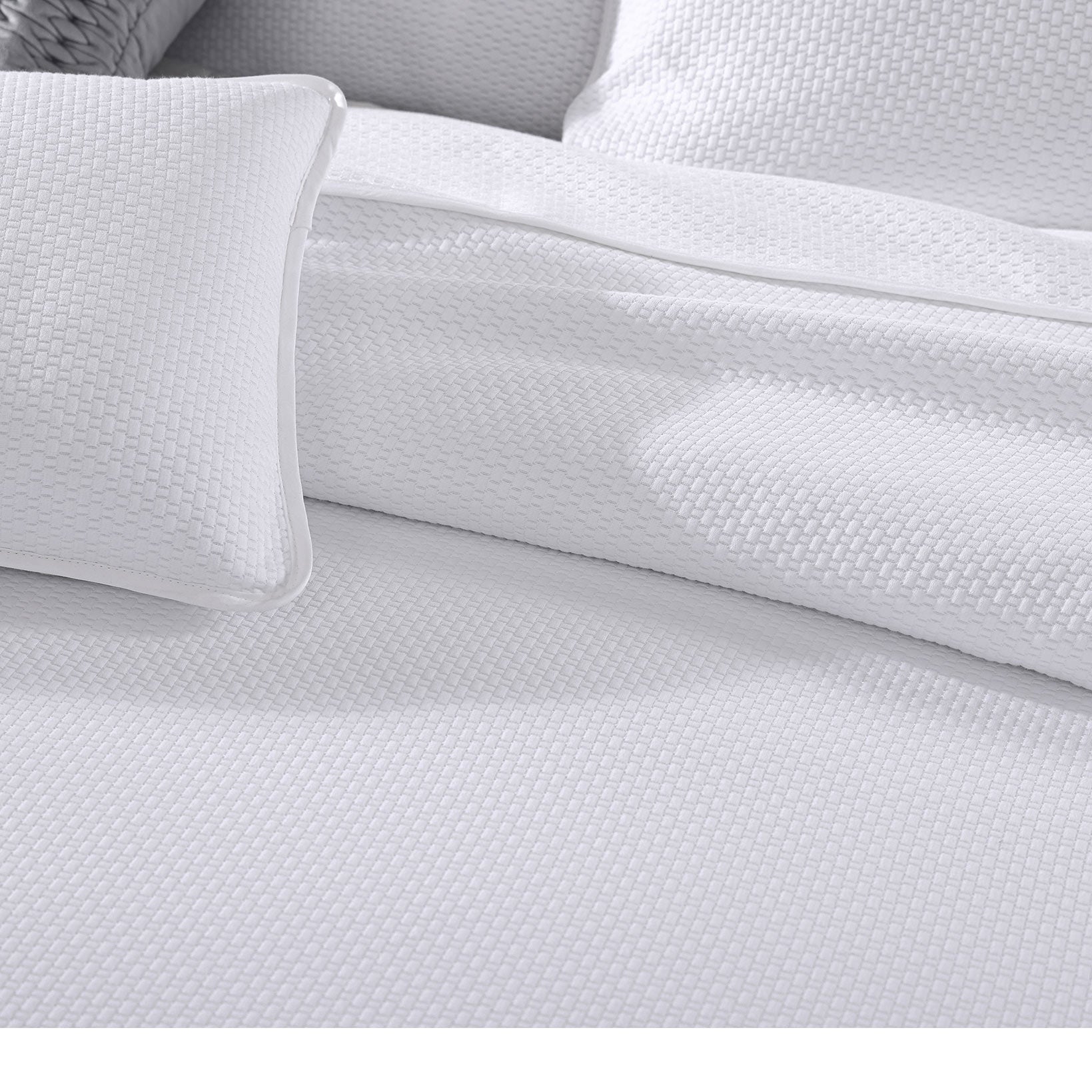 The Cornell Coverlet White by Private Collection is simple, yet sophisticated bringing beautiful texture to the bedroom with its white-on-white embossed basket weave pattern. Complete the look with its matching accessories.