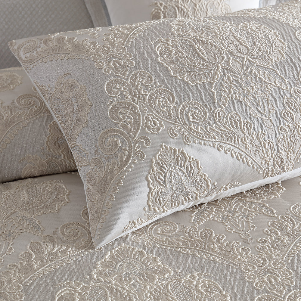 Emerson is a quilt cover set that epitomizes sophistication and luxury while providing a romantic touch. Featuring a beautifully woven jacquard damask in soft ivory and silver, it boasts rich texture and a subtle shine. The coordinating fabrics showcase an embroidered harlequin pattern with metallic lurex accents, adding depth and elegance. Metallic guipure lace inserts and deluxe tassels provide the perfect final touch, enhancing the set’s romantic and opulent appeal.