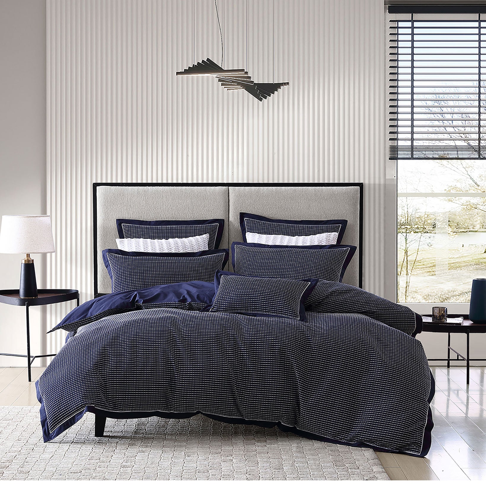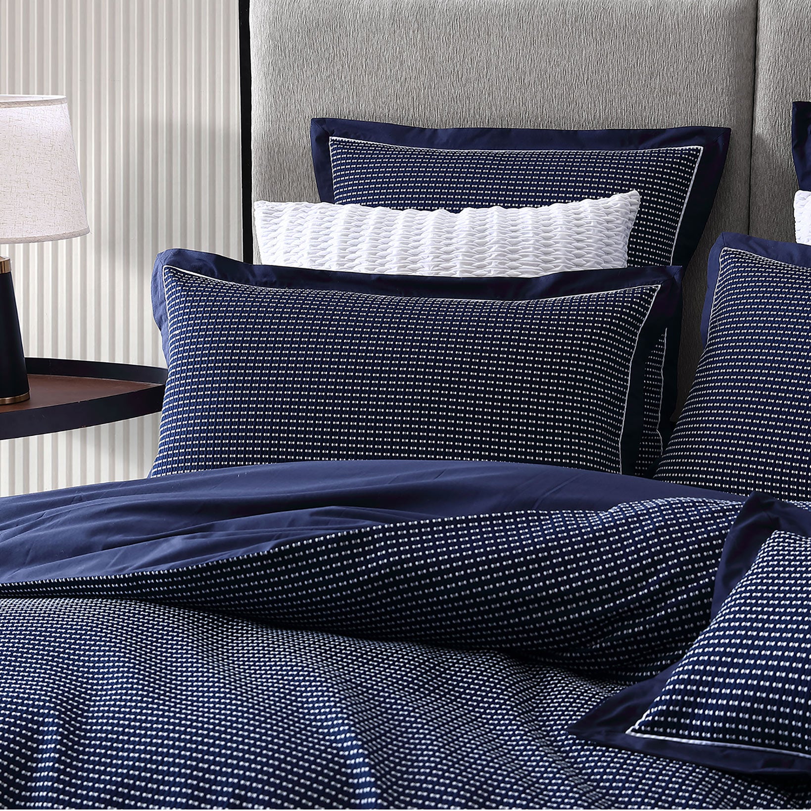 Everton Navy is inherently sophisticated. The all-over delicate geometric pattern is inherently chic, in timeless navy and white palette. The navy attached elegantly frames this design and is finished with crisp white piping. Bolster with Everton's matching European pillowcases to complete the look.