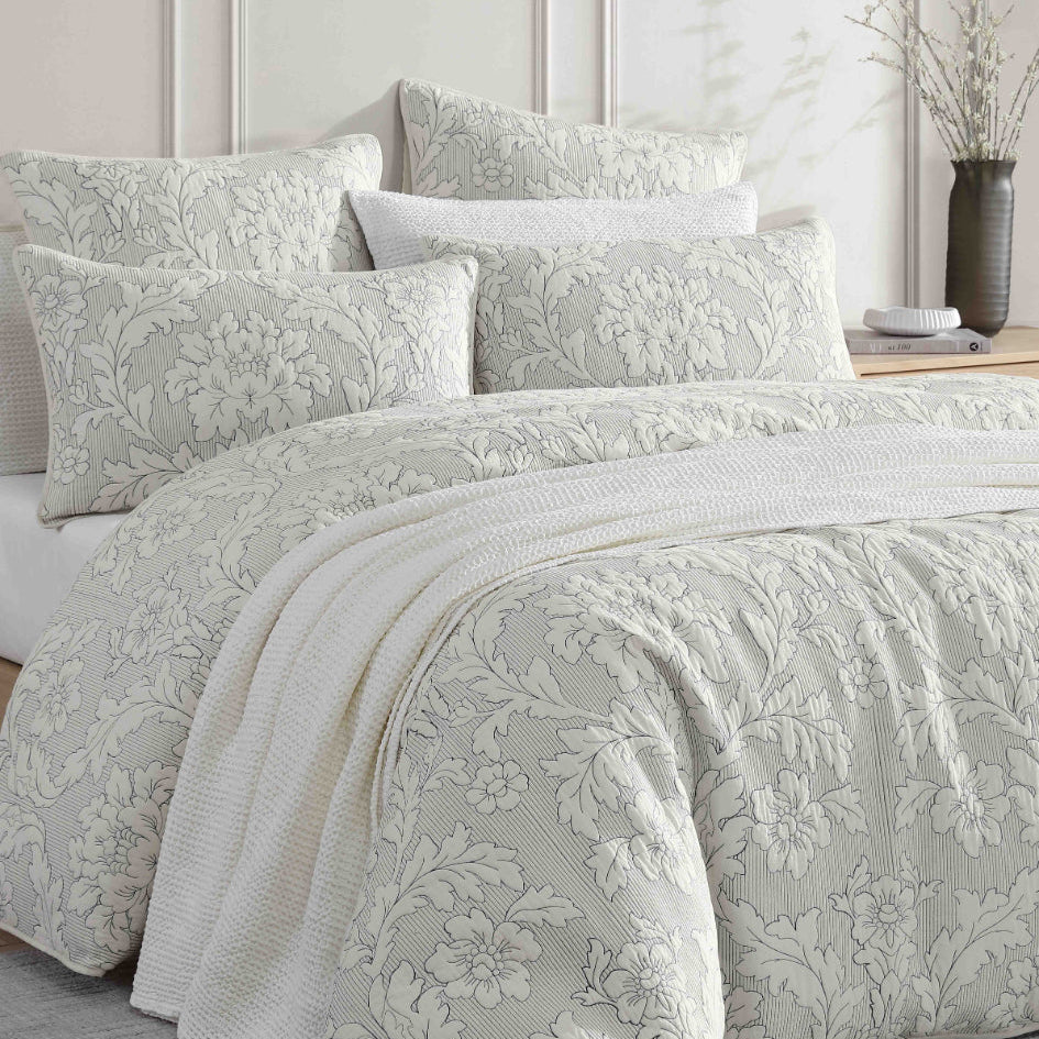 This exquisite quilt embodies true sophistication and beauty. The elegant floral damask pattern is quilted to create a soft, textured fabric, offering a striking contrast to the vertical stripes. Autumn and winter hues of creamy ivory and navy ink form a timeless colour combination, seamlessly complementing any interior style.