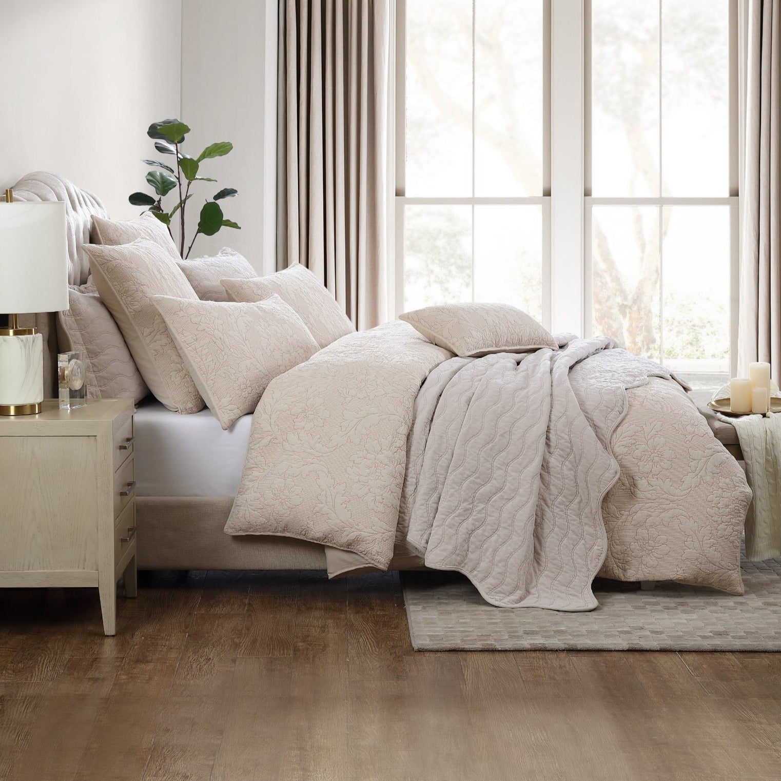 This exquisite quilt captures the true essence of sophistication and beauty. The elegant floral damask is quilted to form a soft textured fabric and contrasts superbly with the vertical stripes. Indulge in the French inspired colour pairings of soft neutrals, Ivory and Silver, Sand and Cedar. Complete the look with coordinating European pillowcases and cushions, ensuring a cohesive and stylish ensemble.