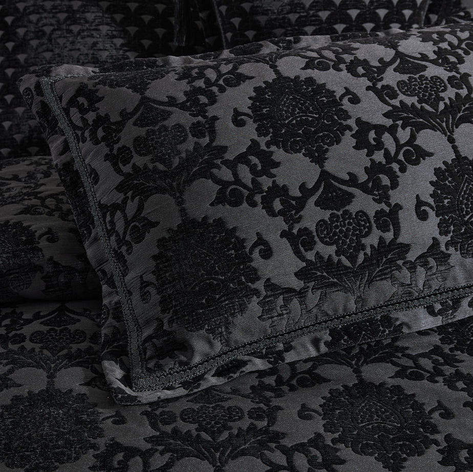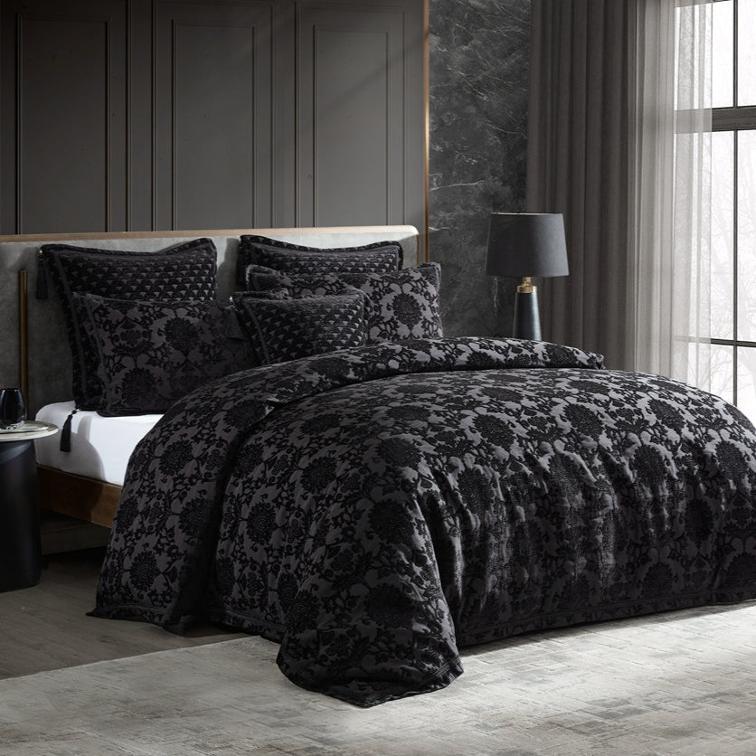 Imperial takes you on a journey with this ethnic damask, capturing the true essence of Davinci’s style. The yarns intricately blend to create a subtle tonal design, featuring a rich velvet shine contrasted with matte surfaces. This interplay of textures adds bold distinction to both the face and reverse of the fabric, allowing versatile use within your design. The dominant black-on-black features ensure this piece stands out as a striking focal point in your bedroom.