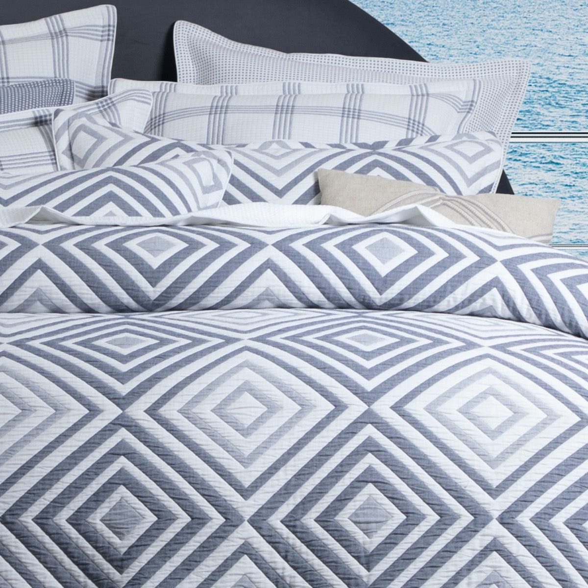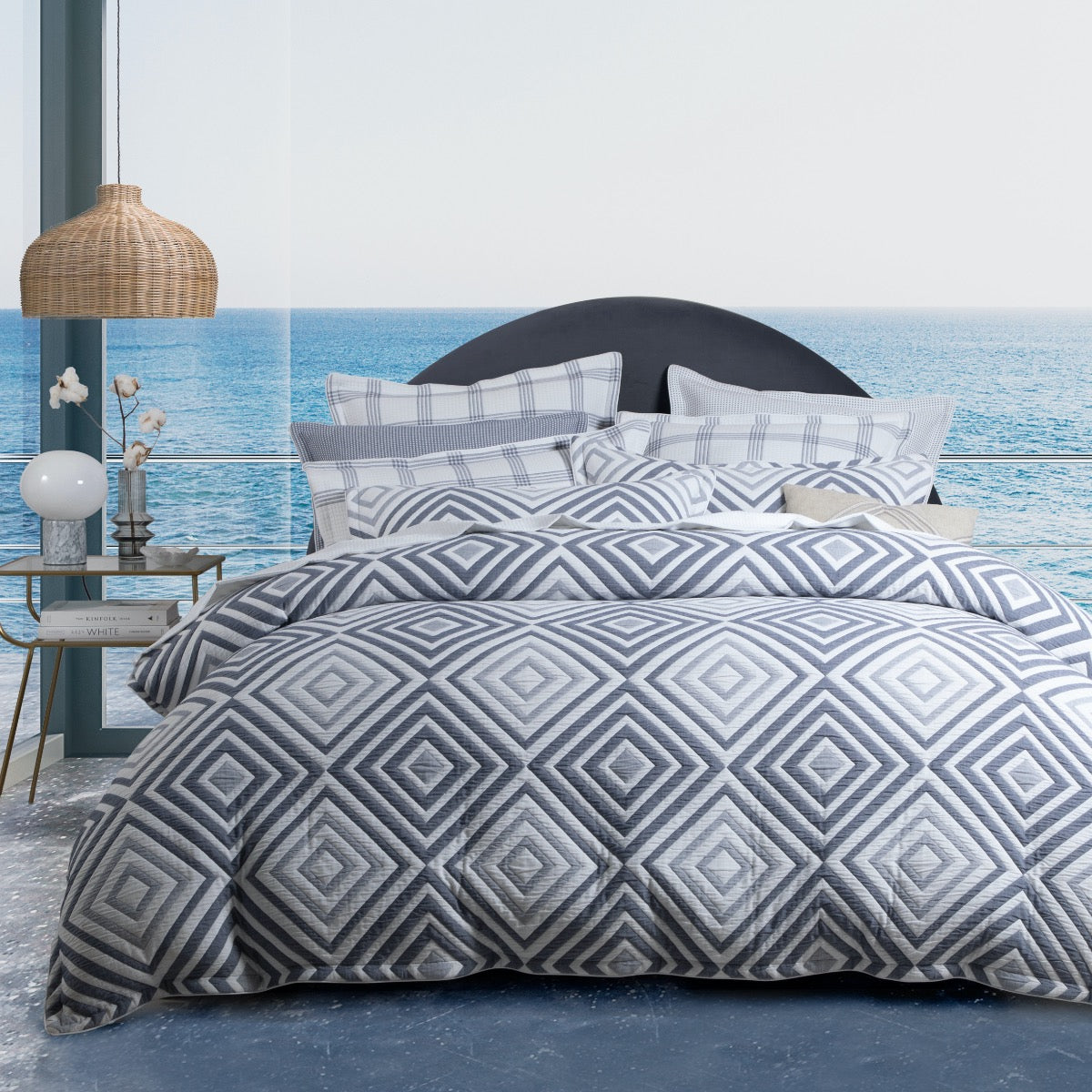 Lambert Ink Quilt Cover Set By Private Collection is a contemporary story that brings pattern to the forefront. The varying scales and colour tones bring cohesion to the composition. Dress with Lambert’s woven check reversible
