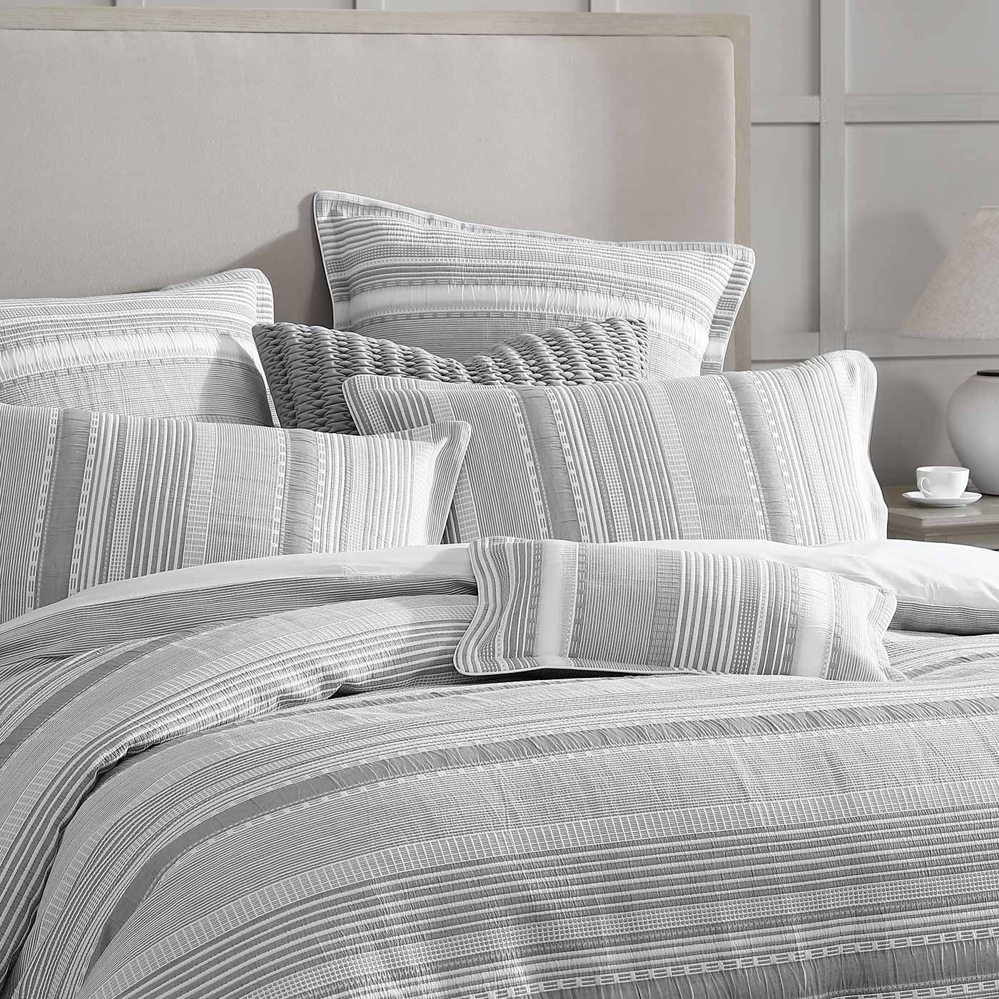 Sinclair Silver combines a modern coastal look with the tactile softness of quilted matelasse. A series of horizontal stripes alternate between plains and patterns balanced by the fresh, tonal palette. Self-flanged and piped edges complete the look.