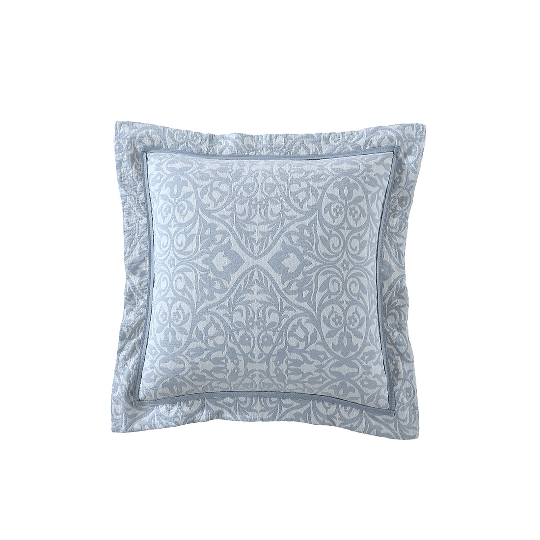 Introducing Althea, a beautiful fusion of tradition and modernity. Featuring a classic damask pattern intricately woven in a cotton jacquard, Althea showcases a contemporary colour palette of soft denim blue and crisp white. The addition of a matte herringbone tape, adds a refined touch, enhancing the overall elegance and sophistication of this timeless piece. Perfect for those seeking to elevate their bedroom decor with a blend of classic charm and modern style.