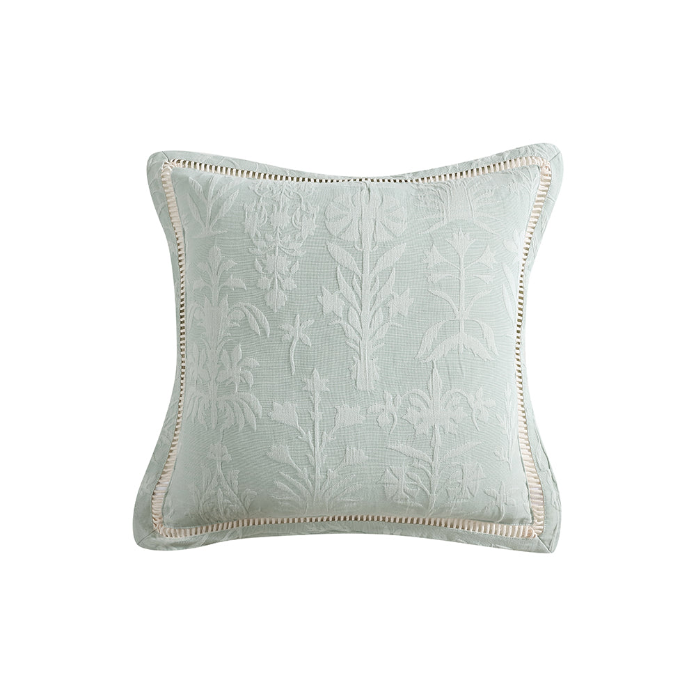 Inspired by artistic nouveau motifs, the Florence quilt cover showcases a soft sage cotton jacquard with a textural matelassé finish. Delicately tailored with a self-attached flange and ladder trim, it brings timeless elegance and subtle dimension to your bedroom.