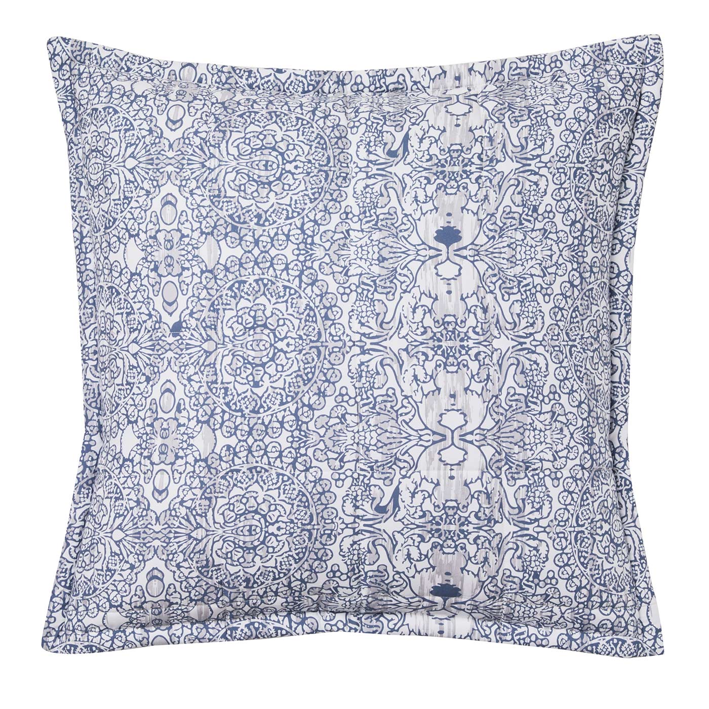 Taking inspiration from artisan's hand-painted tiles, Olani uses traditional motifs styled with modern influences. Olani is a statement piece using subdued shades of crisp summer blues, contrasted by the over-scaled medallion. The style is given a contemporary feel with large square quilting making the design versatile to use with or without an inner quilt.