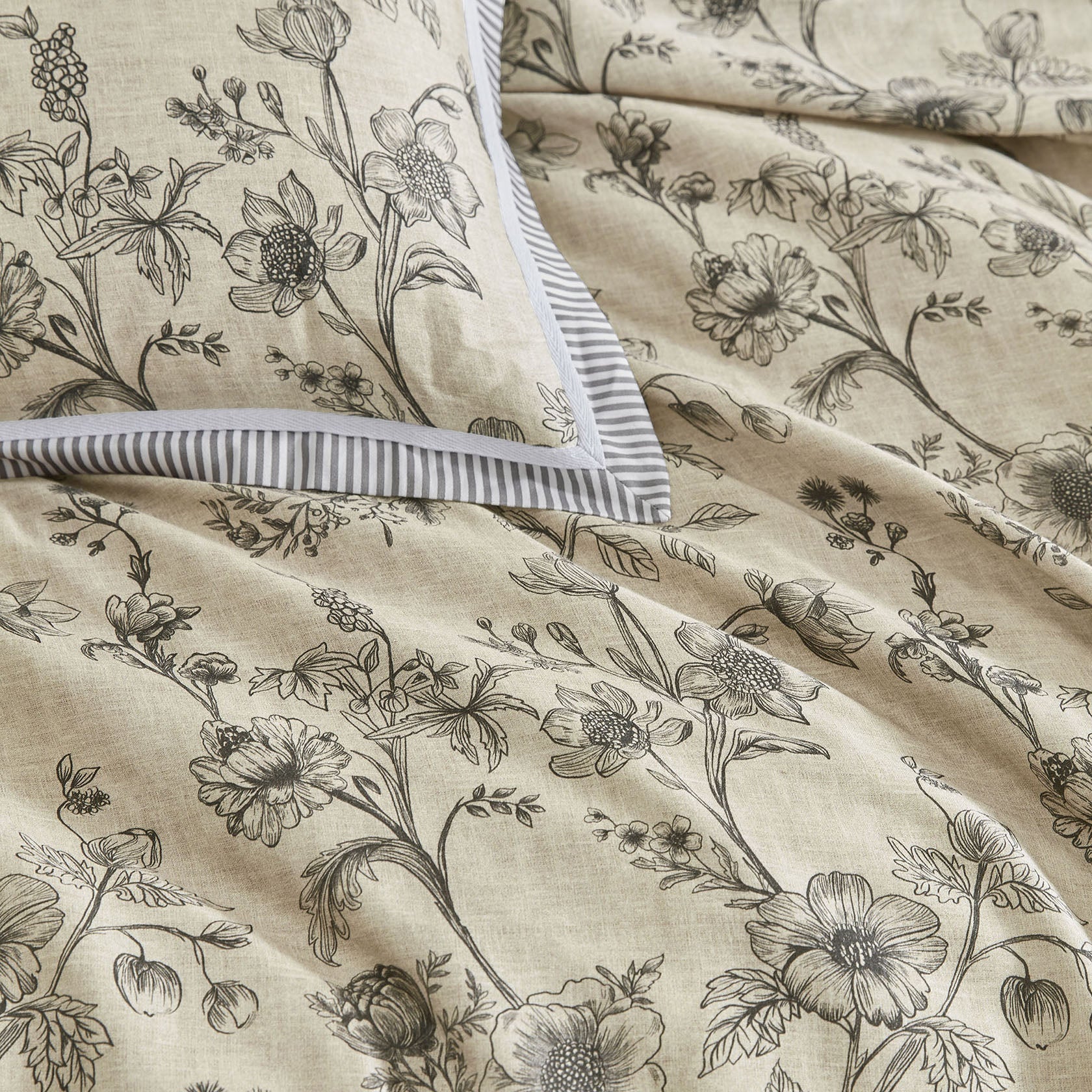 The Perpetua quilt cover set blends classic elegance with modern flair. Delicate hand-drawn florals on a printed linen-textured cotton sateen base, are framed by a tailored flange edge, with pinstripes and a crisp herringbone trim. Its reversible design features a grey and white stripe for versatility, making it a sophisticated statement piece for contemporary interiors.