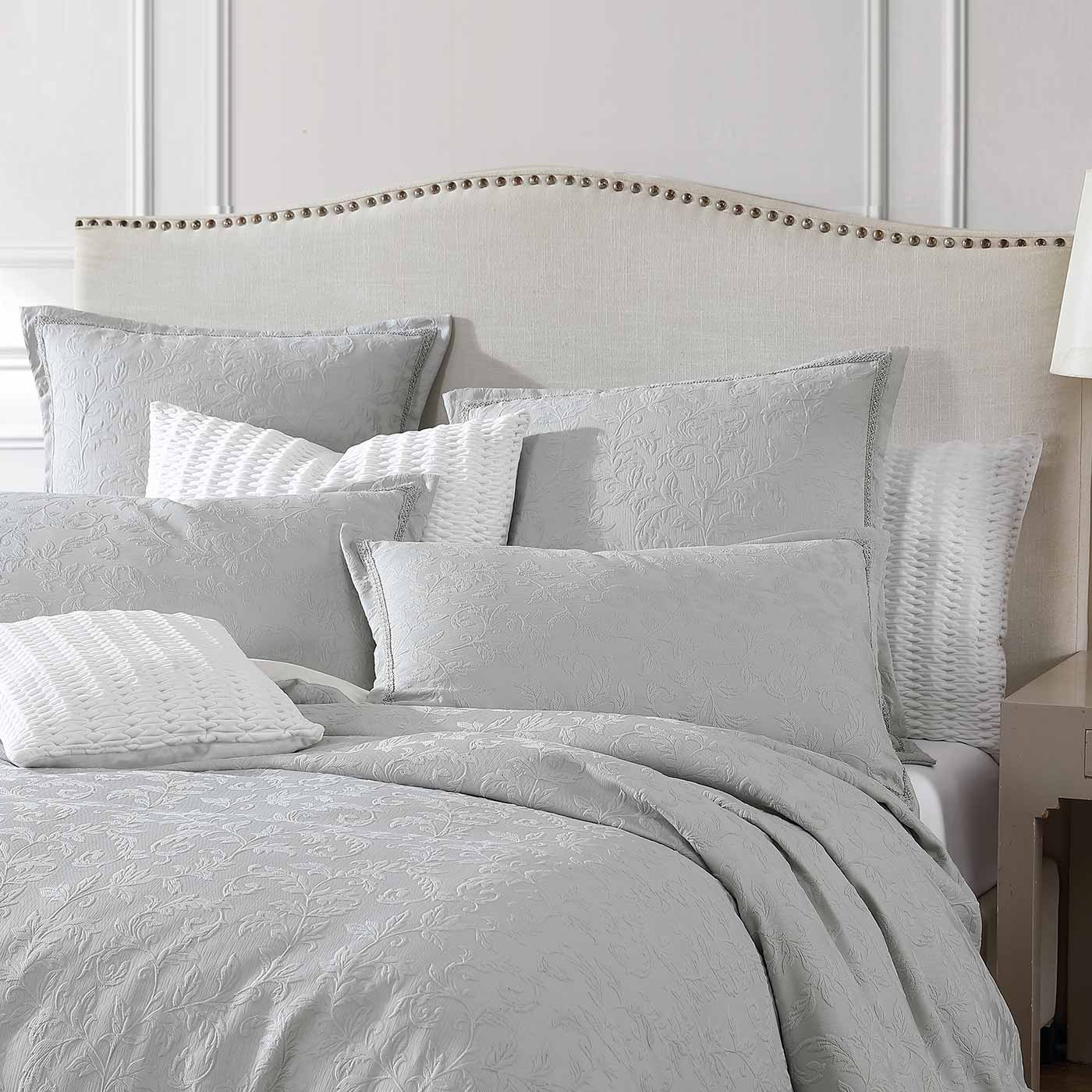 Create a traditional ambiance with the classic styling of Valentina. Delicate floral clusters are woven on a textured ground to create visual and tactile surface definition. The tonal silver braid provides an elegant finish.