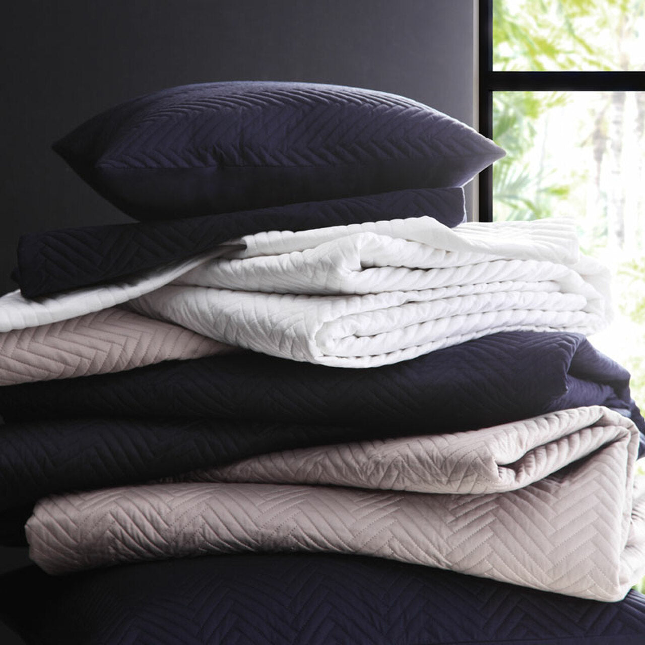 The chevron pattern is both a trend and a tradition; a bold and beautiful design element. Use as a complement to your bed linen or as a sophisticated look on its own, these accessories have wonderful aesthetic appeal that will never go out of style. The range includes a European pillowcase, long cushion, pillow sham and coverlet in three versatile colours – navy, silver and white.