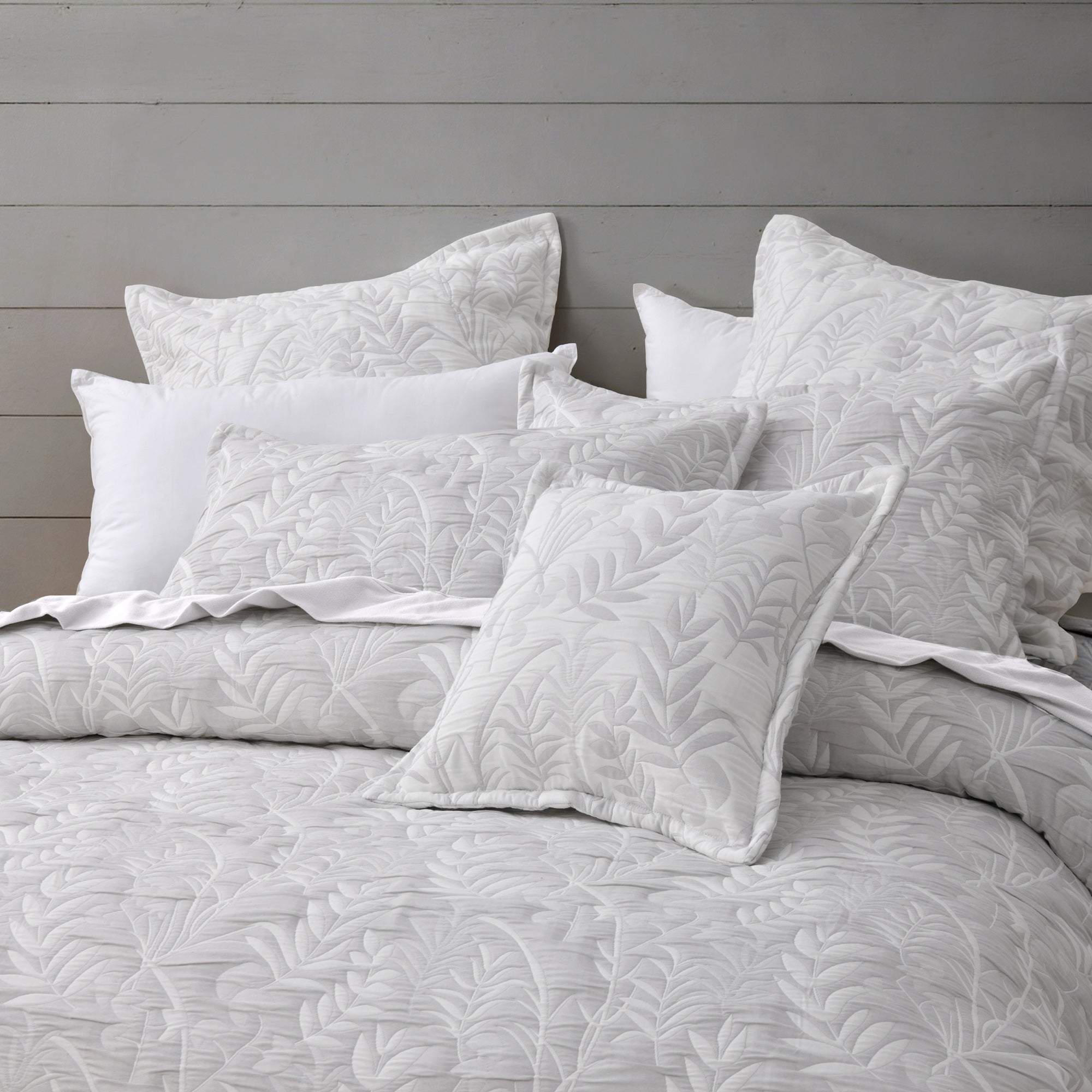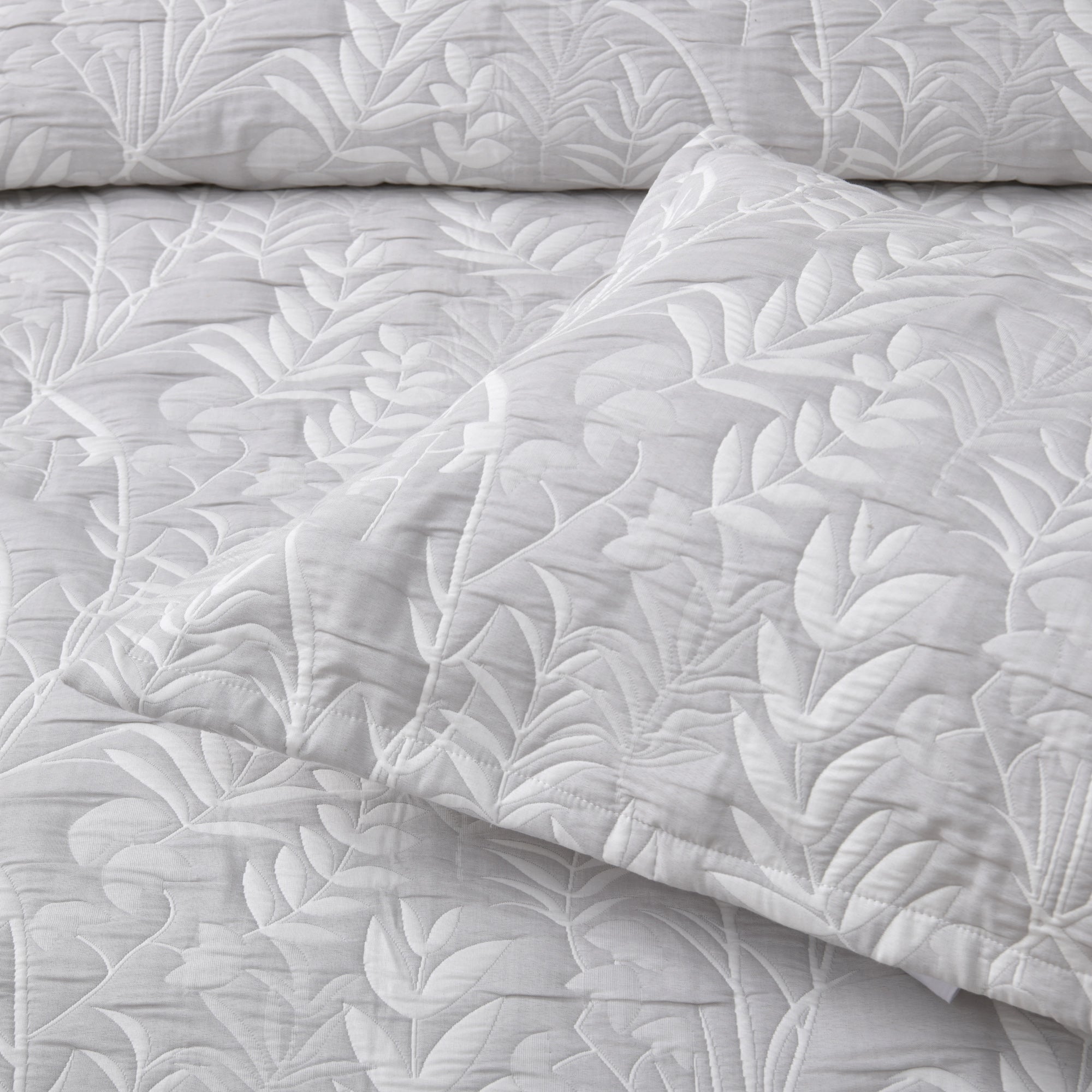 Crafted from a soft polyester/cotton jacquard fabric, this quilt cover set features an elegant botanical pattern in calming white and grey tones. The tailored edges on the quilt cover, pillowcases and cushion add a refined finish, creating a serene and stylish bedroom look.
