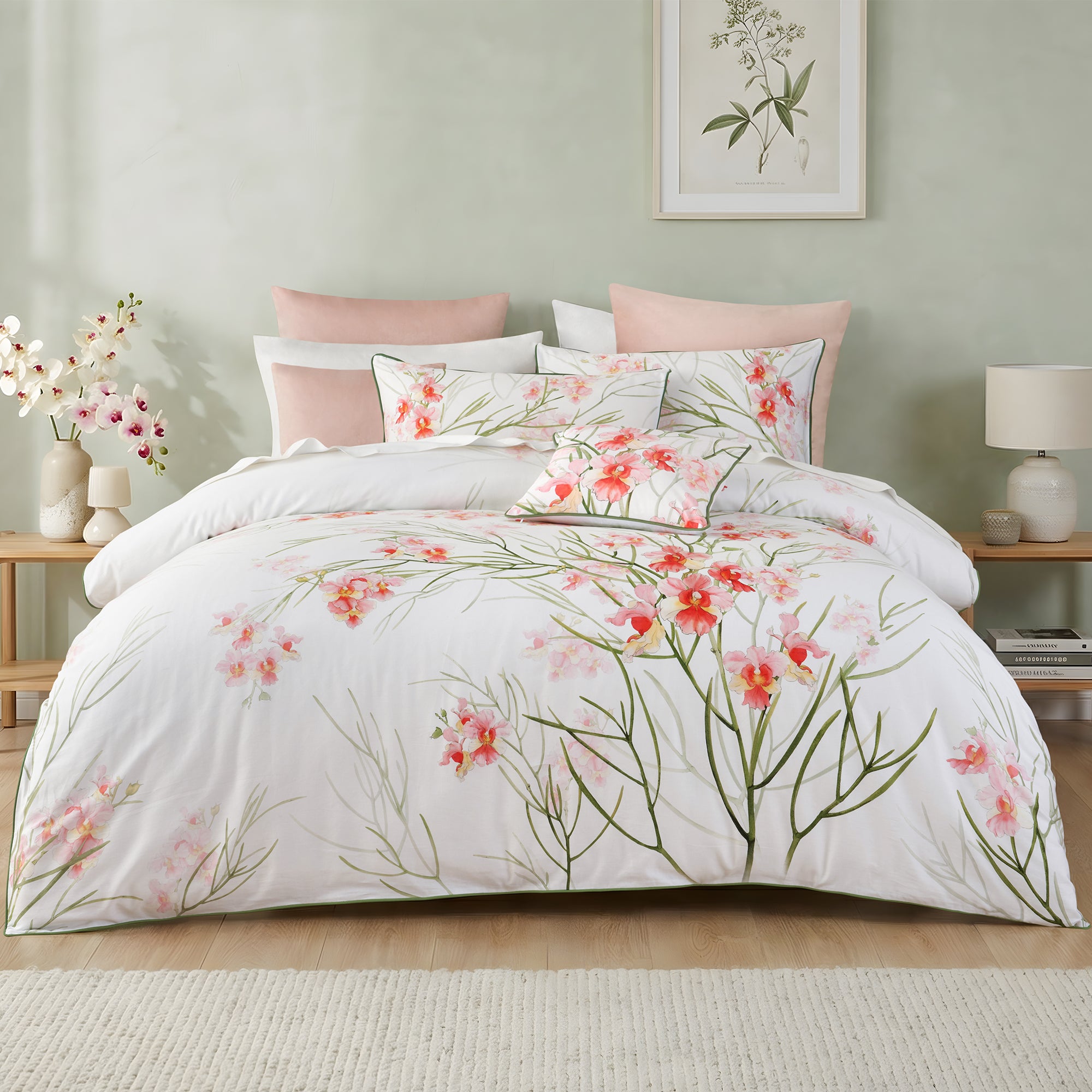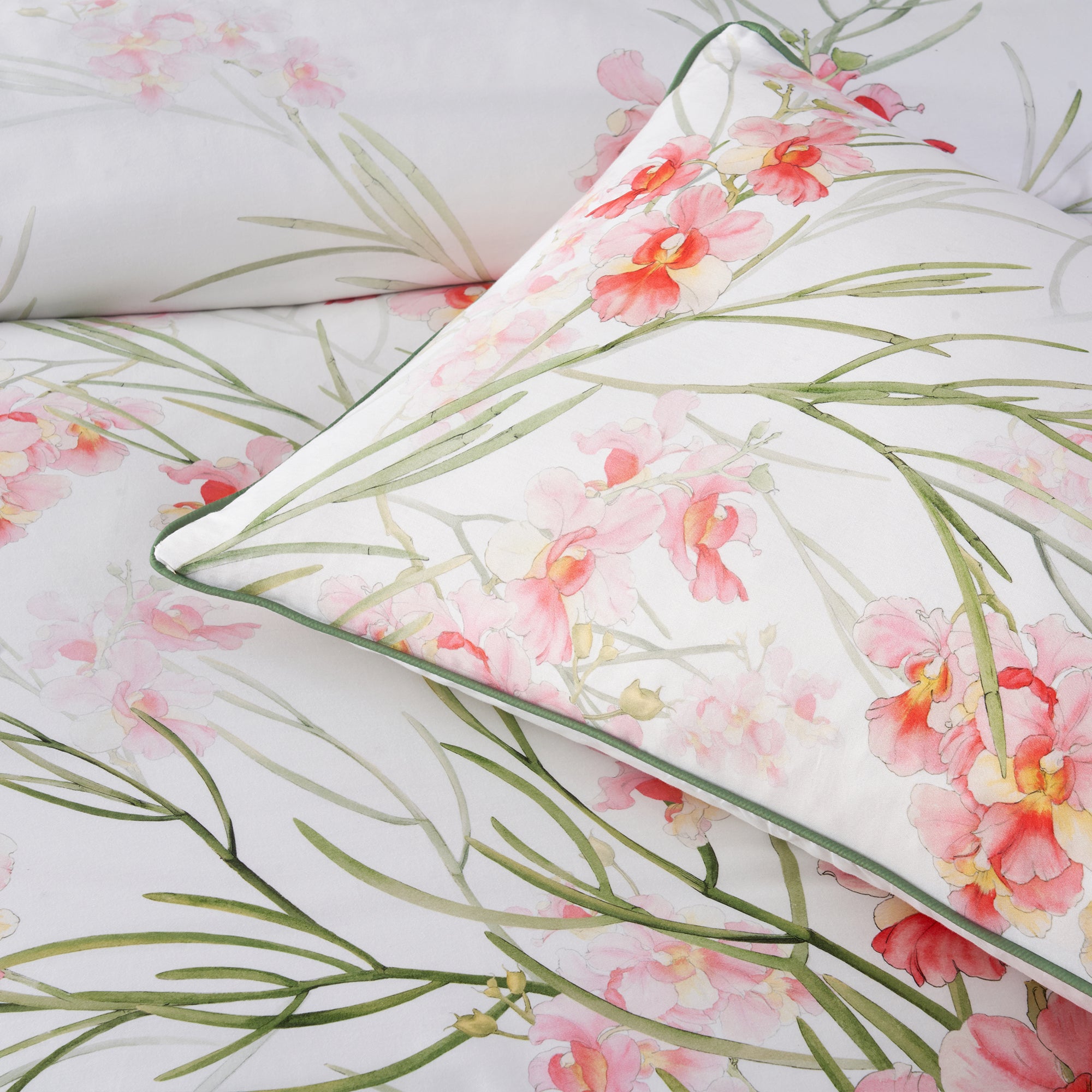 This quilt cover features a crisp white background adorned with delicate pink flowers and graceful green stems. Crafted from smooth cotton sateen, it offers a soft, lustrous finish that brings freshness and charm to your bedroom, while the quilt cover, standard pillowcases and cushions are elegantly detailed with a piped edge finish for a refined touch.