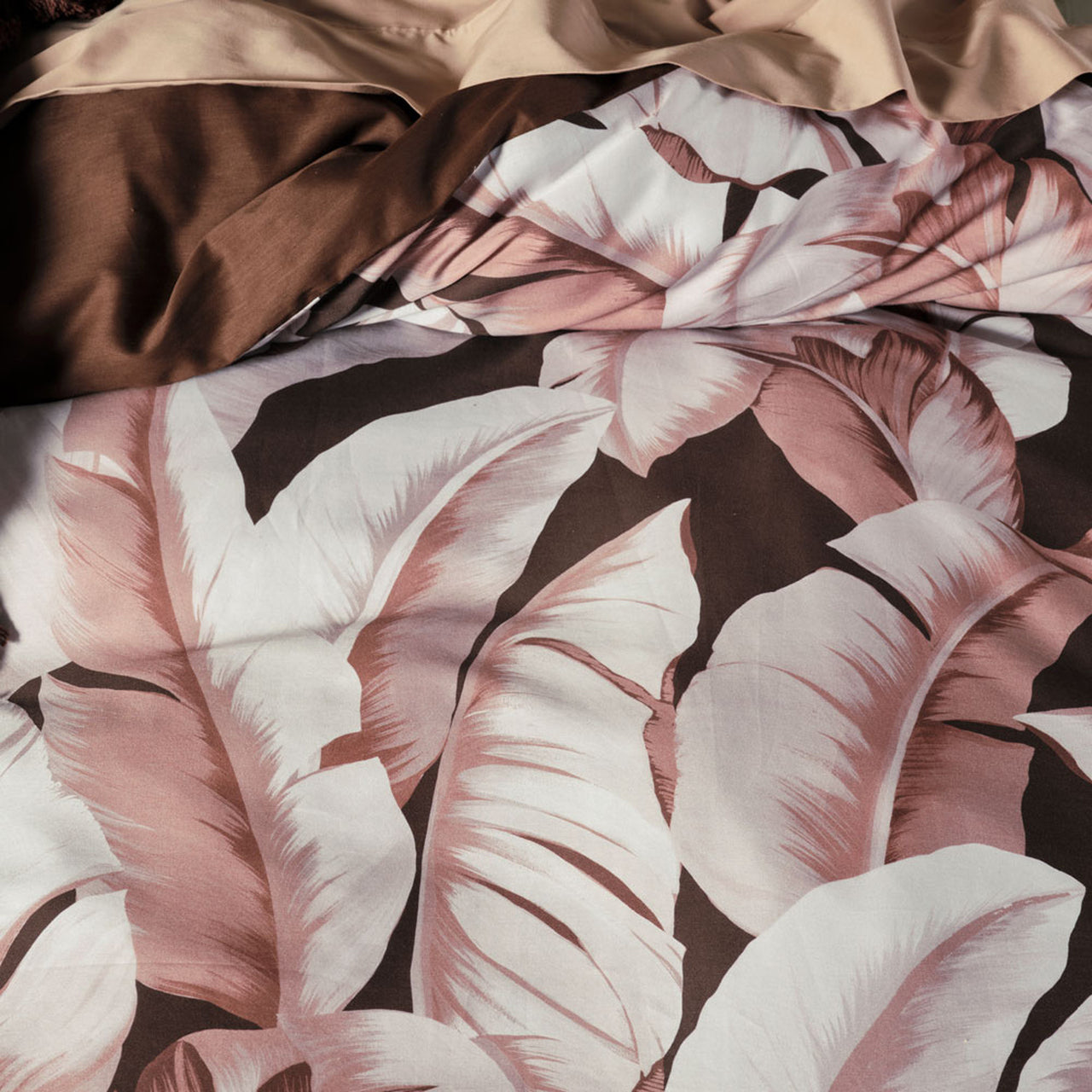 The Kalena Quilt Cover Set Range Cinnamon by Linen House Lifestyle features a design inspired by vintage banana leaf wallpaper, where each leaf is hand-painted to create a jungle of lush foliage. Printed on cotton sateen, this quilt cover set is your modern alternative to the traditional green banana leaf. Style this ensemble with coordinating European pillowcases and its cotton-fringed cushion.