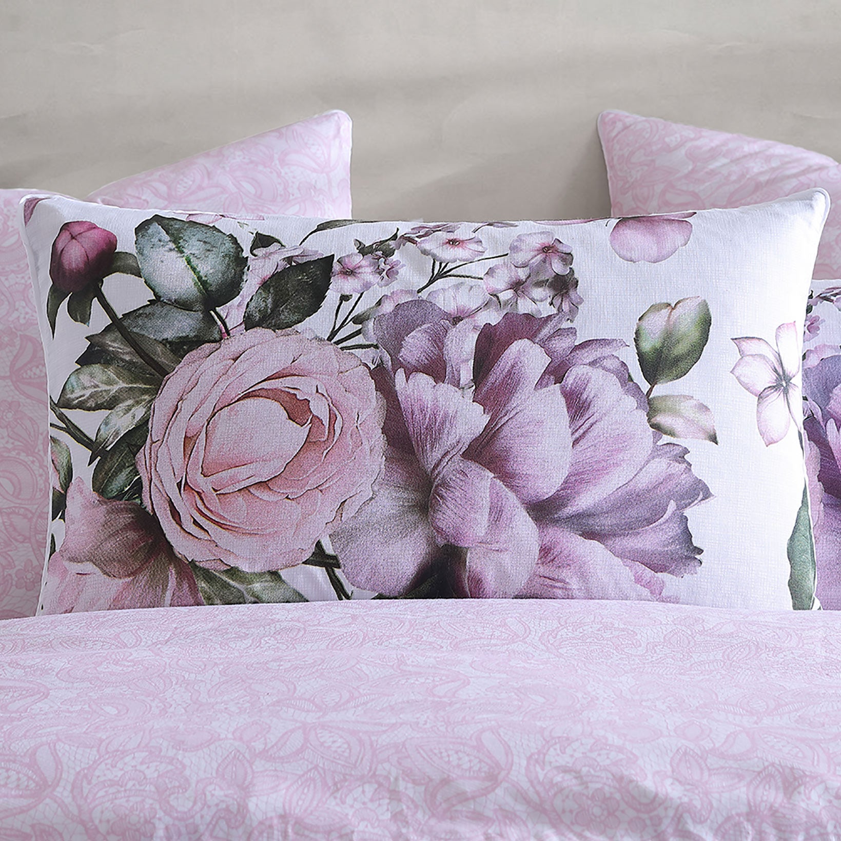 Elodie Blush is a stunning design showcasing beautiful floral elements in every shade of pink and blush. A delicate lace patterned reverse, complements this pretty design, creating a pleasing visual contrast. White piping completes this romantic look. Match with European pillowcases to finish off in true style.