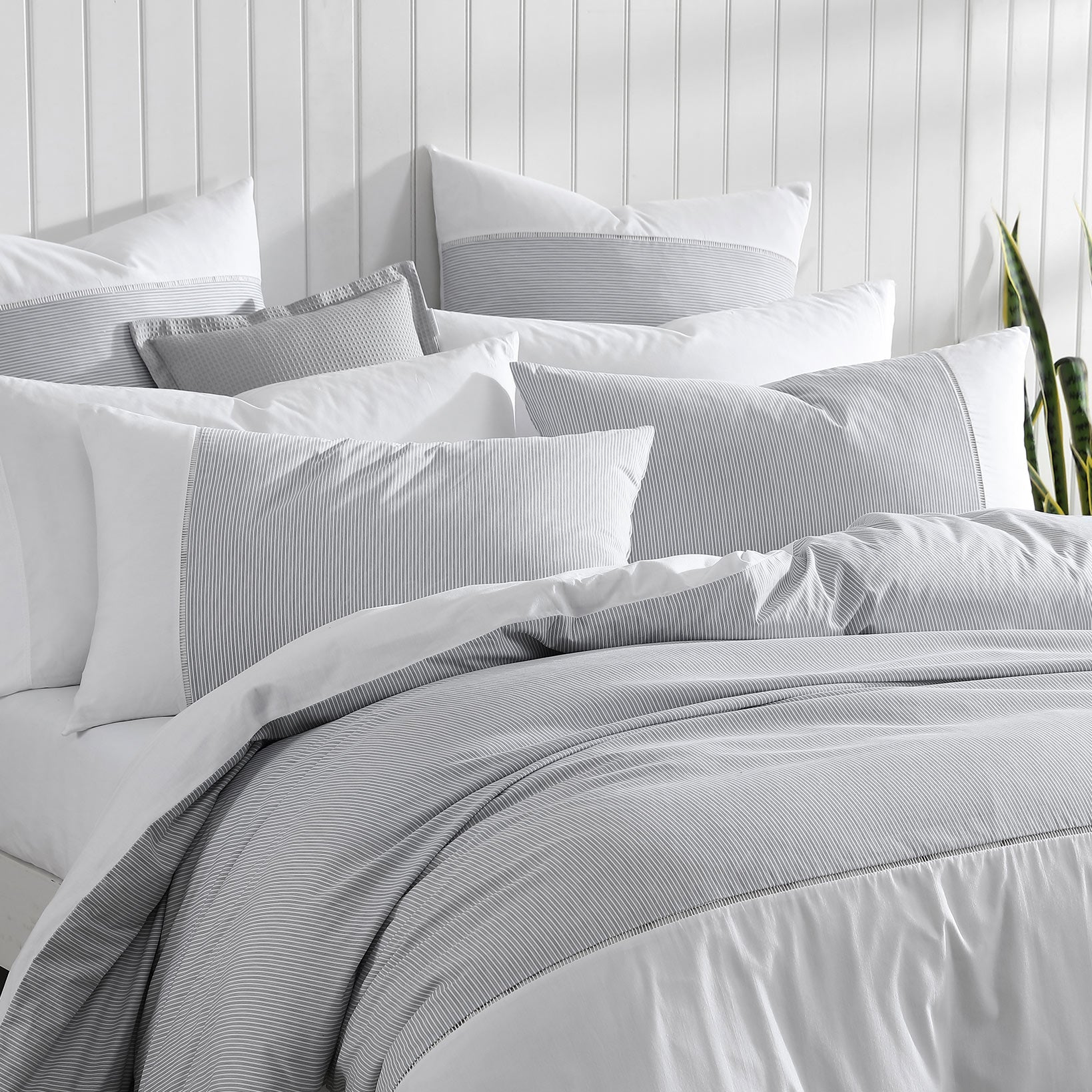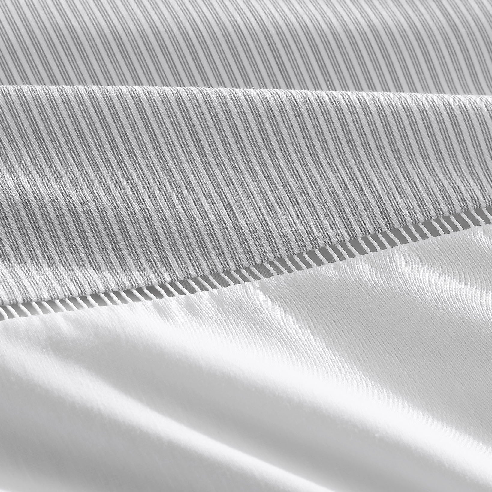 Breathe life into the bedroom with the freshness of Radley Charcoal. Cotton rich percale fabric is printed with a delicate pinstripe and is elegantly finished with inserted white ladder tape. Enhance with Radley's matching european pillowcases to complete the look.