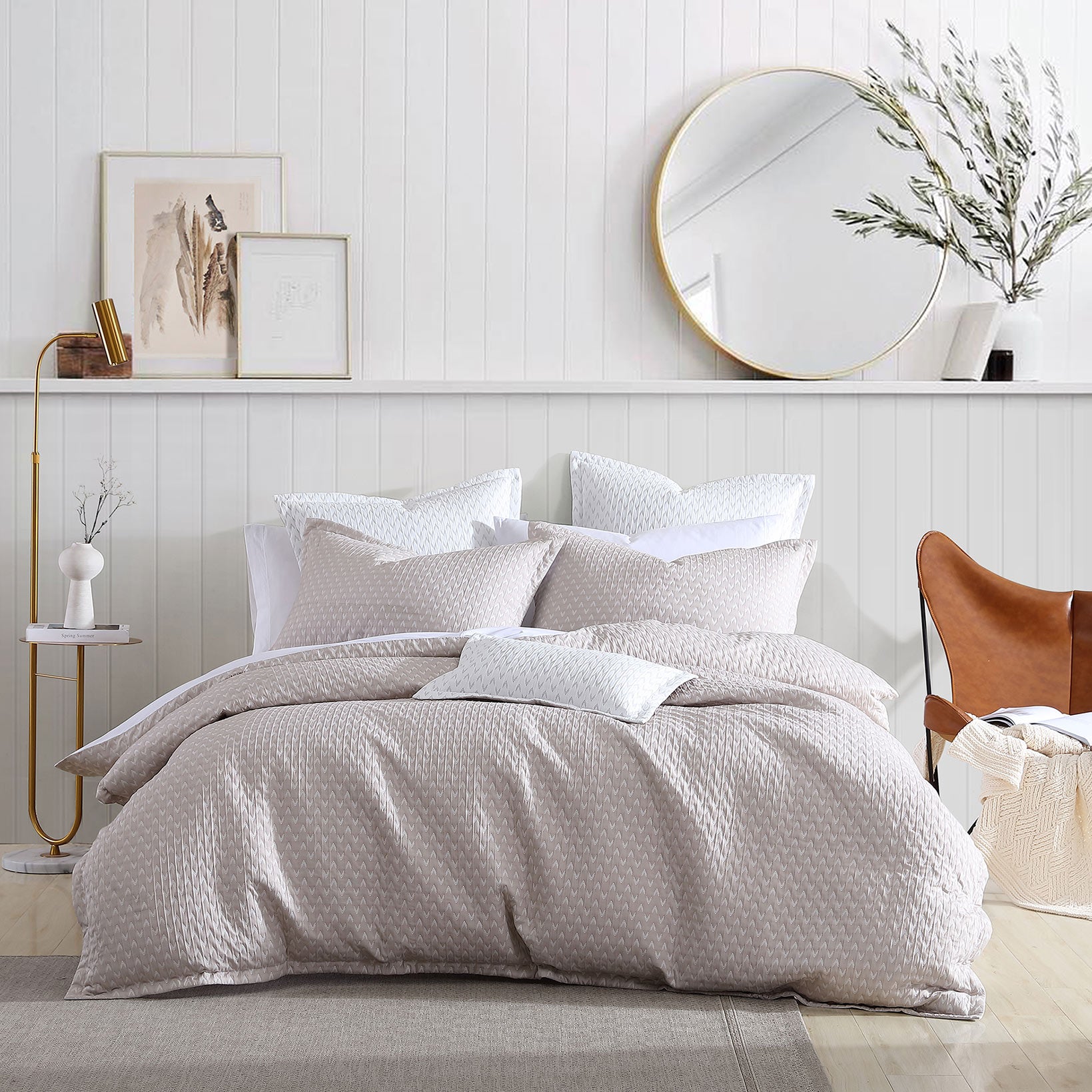 Varsity Linen is a simple, yet classic design featuring rows of large scale arrowheads in white on a neutral linen ground. Neatly styled edges are finished with a self-flange and the look is completed with co-ordinating european pillowcases. The cover is luxuriously quilted for downy-soft texture and easily converts to a coverlet by simply removing the inner quilt.