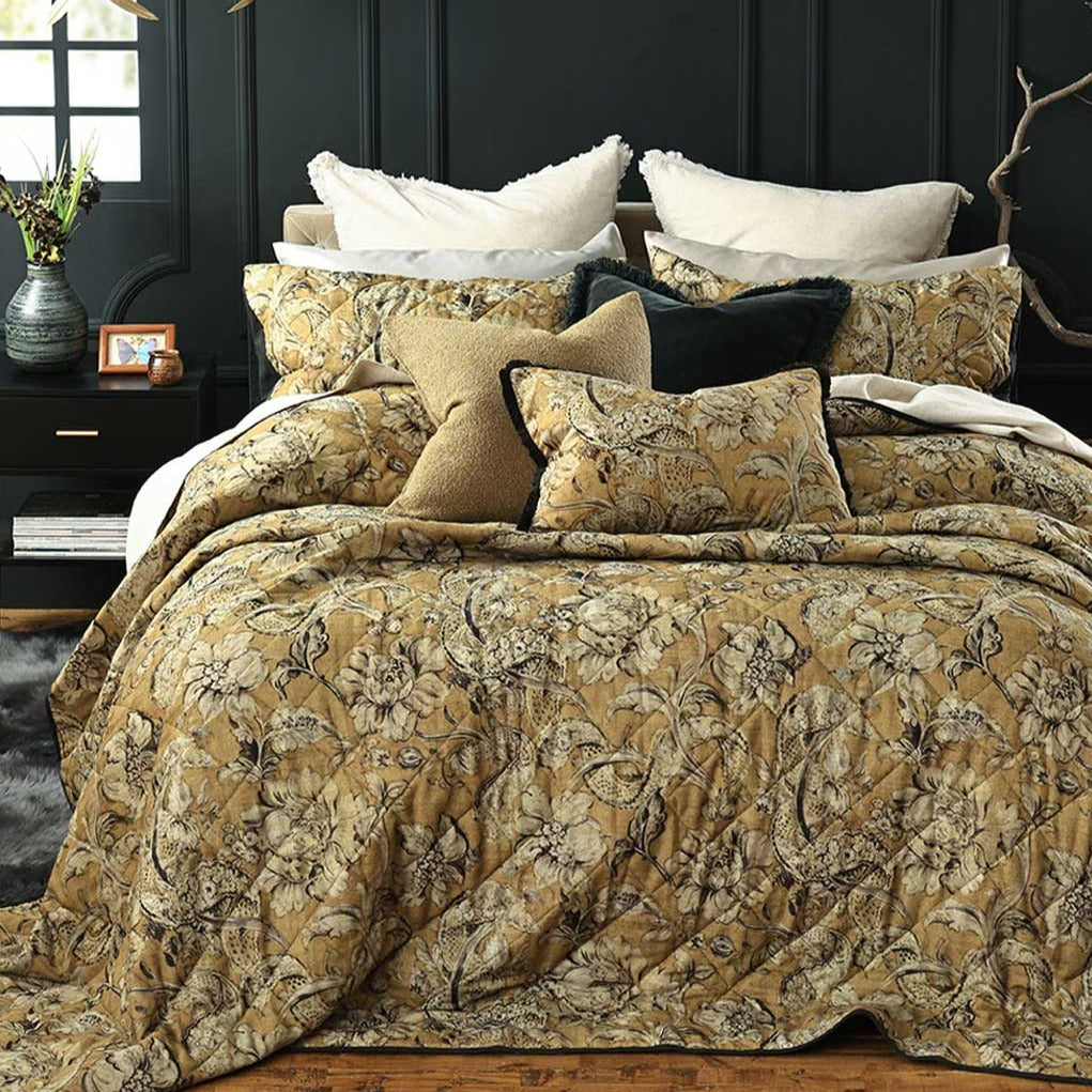 Bold scrolls and filagrees of charcoal are intermingled with on-trend mustard yellow upon M.M Linen's Dijon Bedspread. The aesthetically balanced bedspread design is printed upon a base of quilted linen cotton, with a plain charcoal reverse.