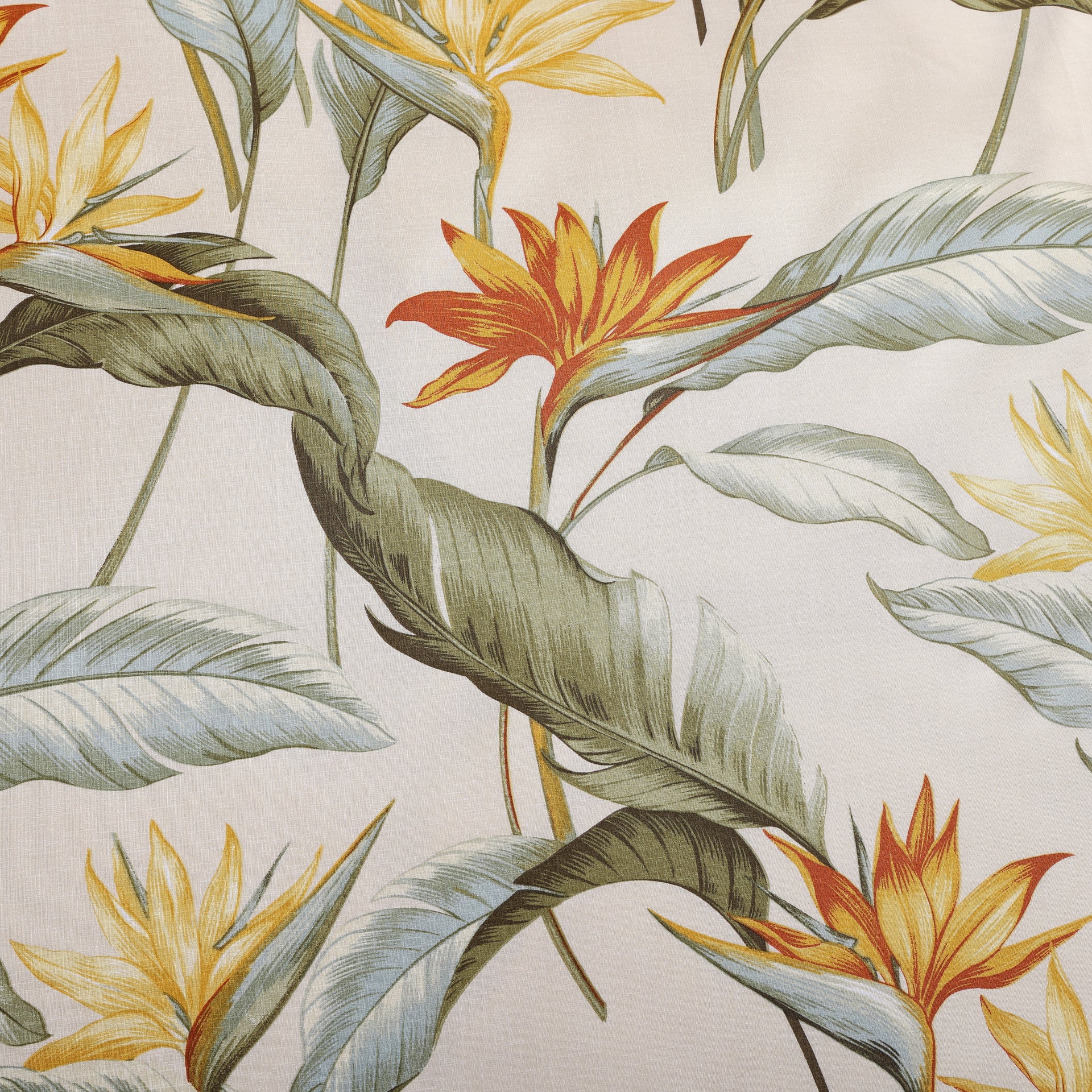 Transform your bedroom into a tropical escape with the Birds Of Paradise Duvet Cover set. This beautiful design features a tropical palm design in muted ivory and green tones with orange and yellow accents with an ivory textured printed reverse.