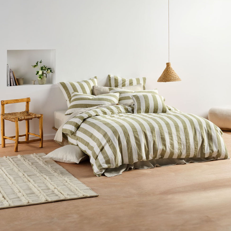 The Vintage Stripe Quilt Cover Set Range Pesto by Linen House features a classic yarn-dyed stripe, offering a contemporary, easy-living aesthetic to last beyond trends and seasons. Made from a washed linen-cotton blend, this fully reversible design is even more inviting when styled with its matching European pillowcases and square cushion.