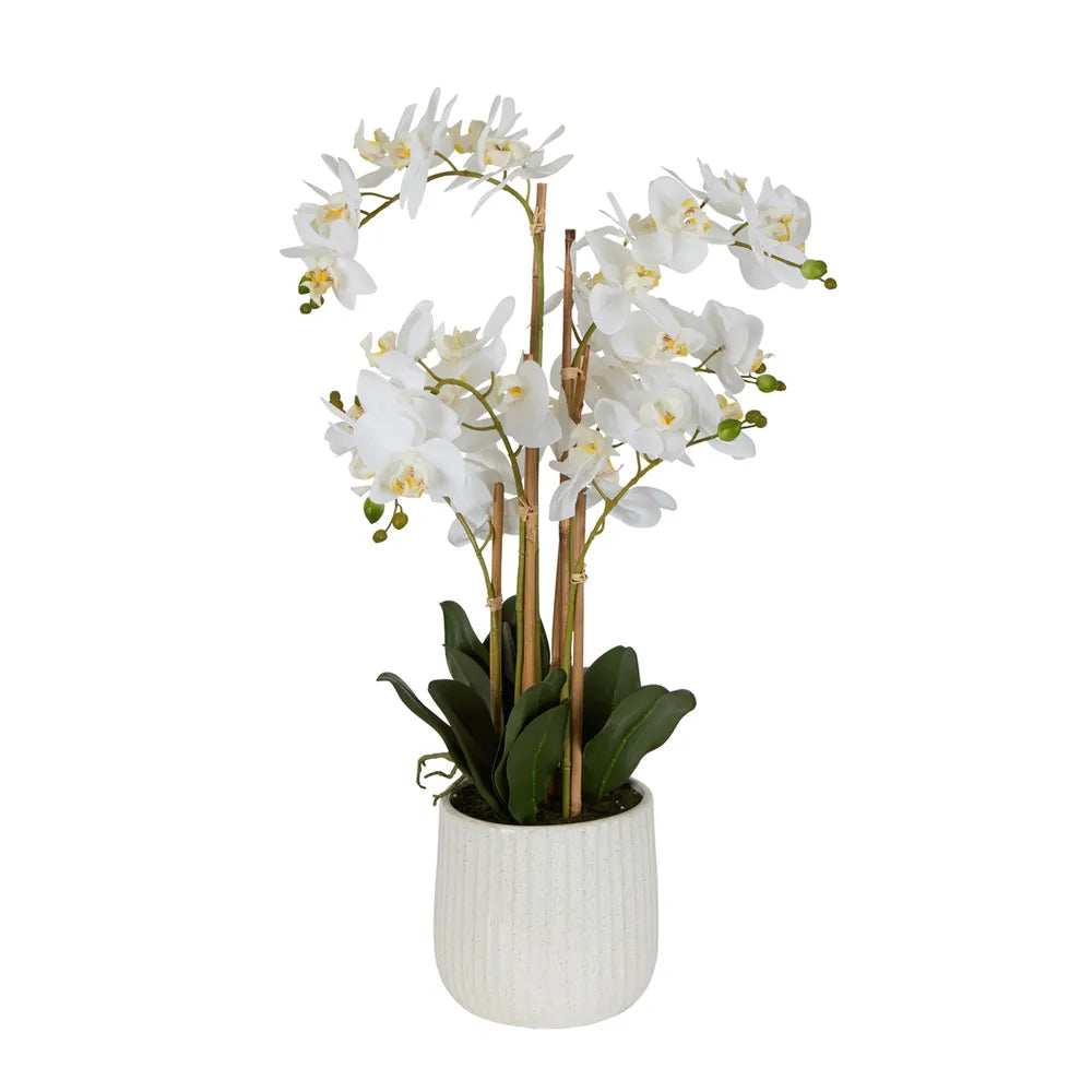 Indulge in the everlasting beauty of the Real Touch Orchid In Ceramic Pot - a sophisticated statement of elegance that will brighten your space every day. Delicate white blooms sway gracefully atop slender stems, creating a natural display of pure beauty. Nestled in a pristine white ceramic pot, with exposed roots and lush dark green leaves, this lifelike masterpiece exudes elegance from every angle. Ideal for any room in your home, from the living room to the office, and perfect for enhancing any space with its timeless charm.