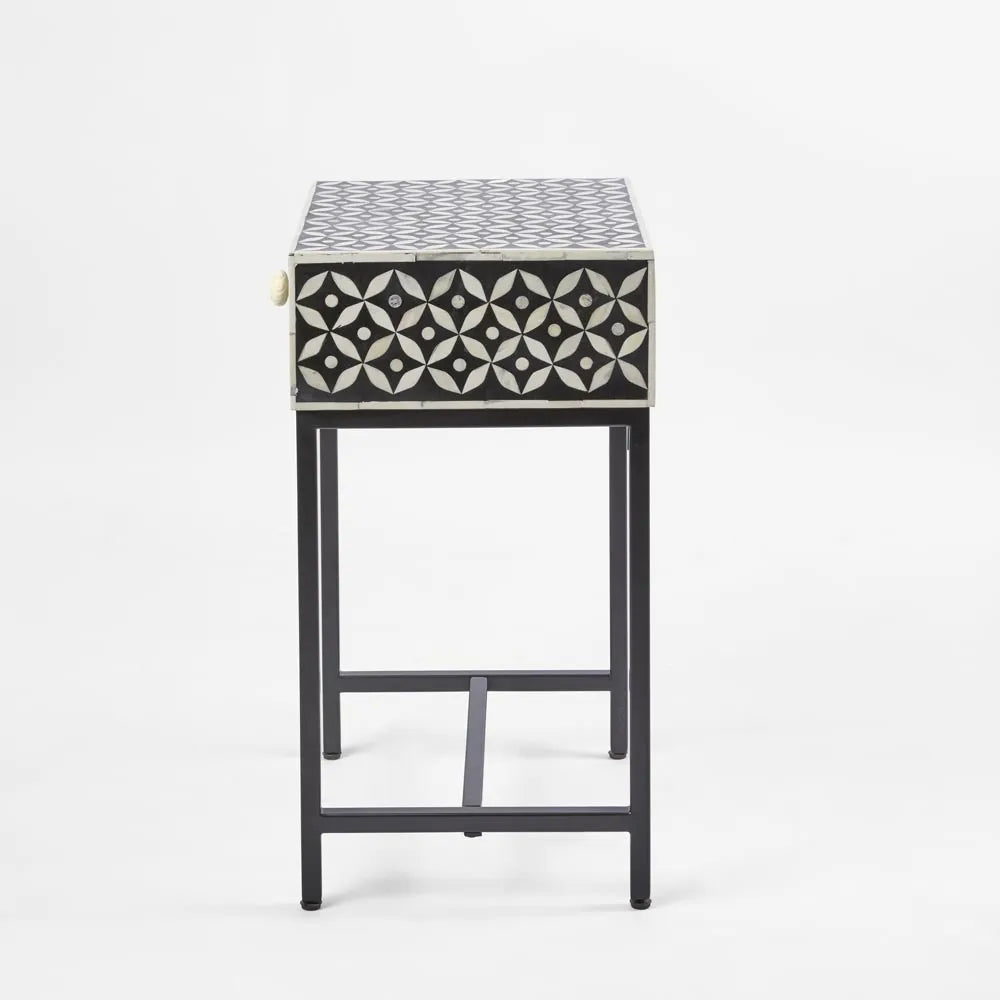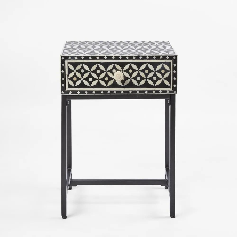 Transform your space with this exquisite bone inlay masterpiece. Use it as a side table or bedside, complete with a convenient storage drawer held by sturdy double extension metal runners, elegantly resting on a steel frame. Handcrafted with ethically sourced buffalo bones from India, each piece is one-of-a-kind. The timeless artisinal tradition of Bone Inlay originated in Rajasthan, India for the opulent palaces of royalty. Months of intricate hand-carving and mosaic-like placement of buffalo bone fragments precede the final step of filling the surrounding space with resin.