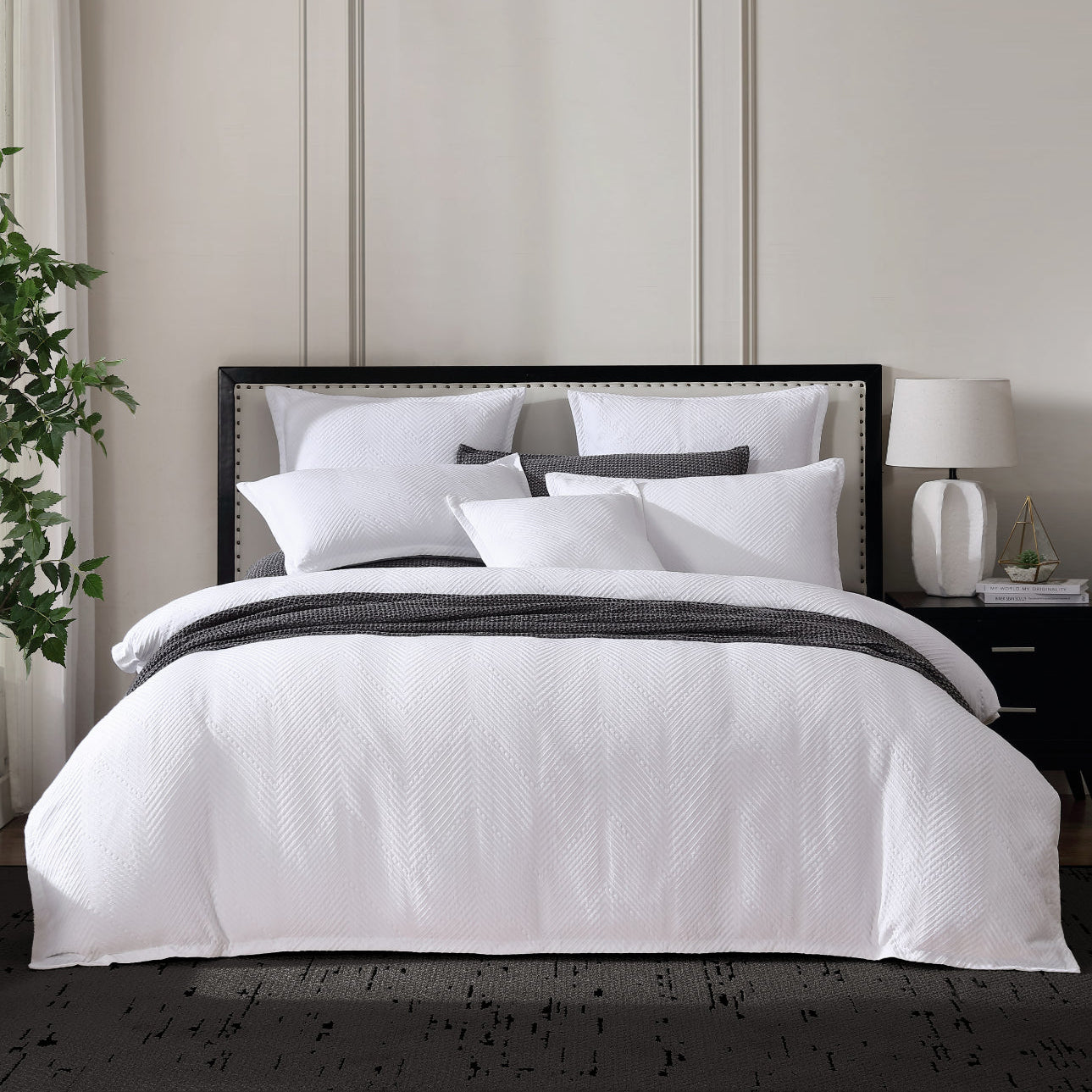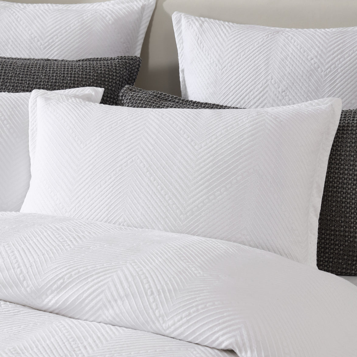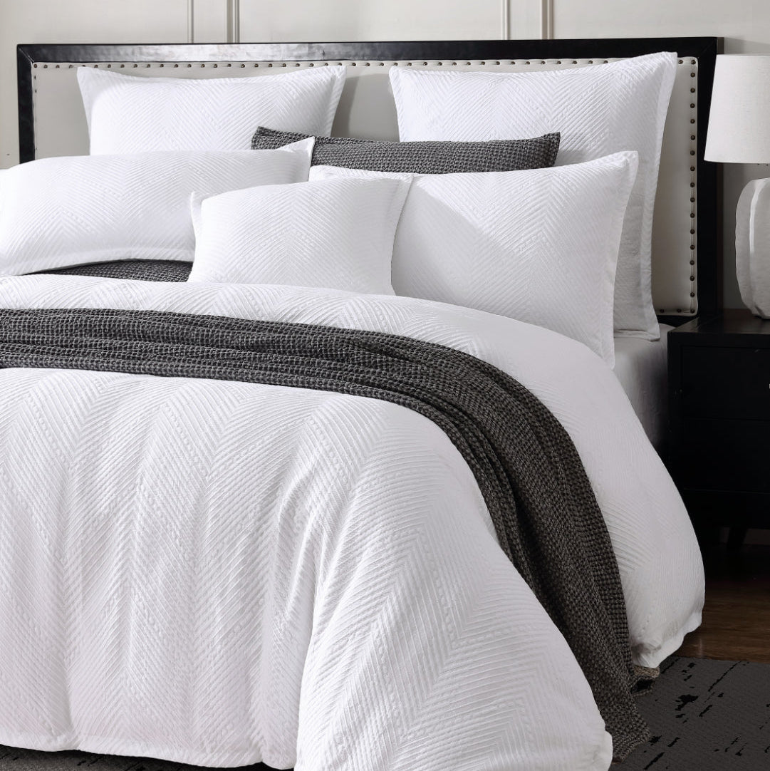 Viva quilt cover is a stunning blend of classic craftsmanship and contemporary design. Featuring a woven matelassé in a striking herringbone pattern, Viva’s tonal white finish enhances its modern appeal, making it a versatile choice for any interior style. Refined with a simple self-tailored flange, this quilt cover exudes elegance and sophistication, ensuring it is the perfect addition to your bedroom decor.