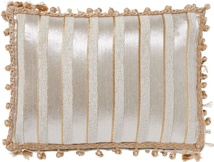 Arison Gold embodies the lavish ornamentation of the Rococo era. The scrolls and sinuous curves of the damask floral pattern are heightened by the softly textured chenille fabrication, outlined with metallic gold contours for that palatial touch. Arison’s co-ordinating accessories reverse to regency stripes for multiple styling options.