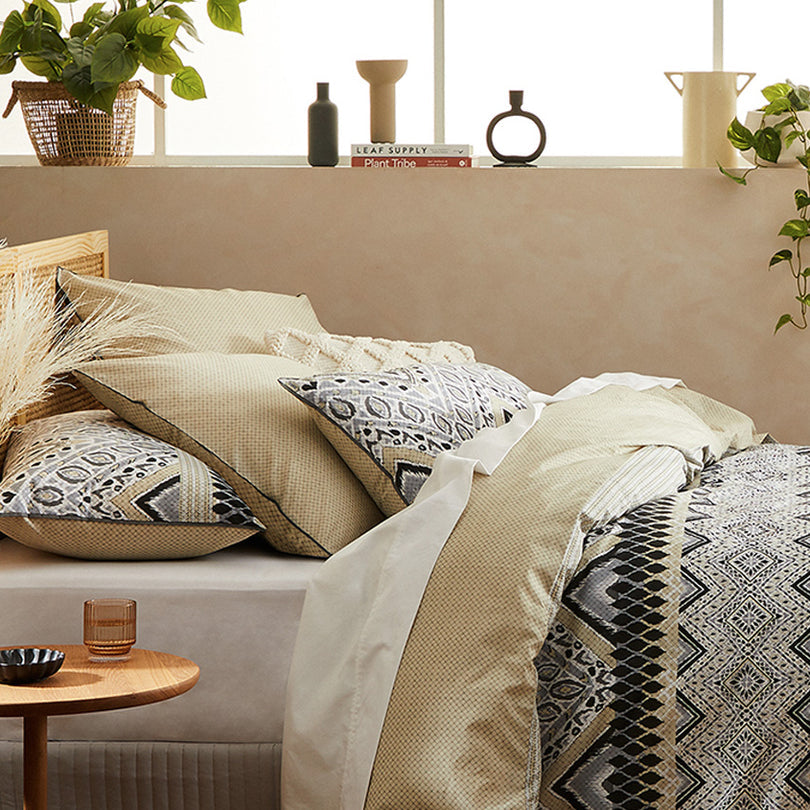 Chayton Linen takes heritage tribal elements to form a design that echoes the skills of traditional artisans. With its tonal use of black and highlights of linen, it creates a natural bohemian style. The exquisite printing capabilities allow the cross stitch pattern to look three dimensional as if it was hand embroidered by artisan crafters. Chayton is piped in charcoal , this added detail frames the unisex palette and makes it suitable for everyday bedrooms.