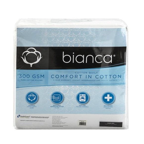 The Bianca Comfort in Cotton Single Bed Quilt is a 300GSM summer weight cotton quilt, encased in a 300 thread count cotton Japara cover. This quilt features a cloud quilting pattern with an elegant cuffed edge. Health guard treated which inhibits the growth of bacteria fungi and dust mites. Fully machine washable.