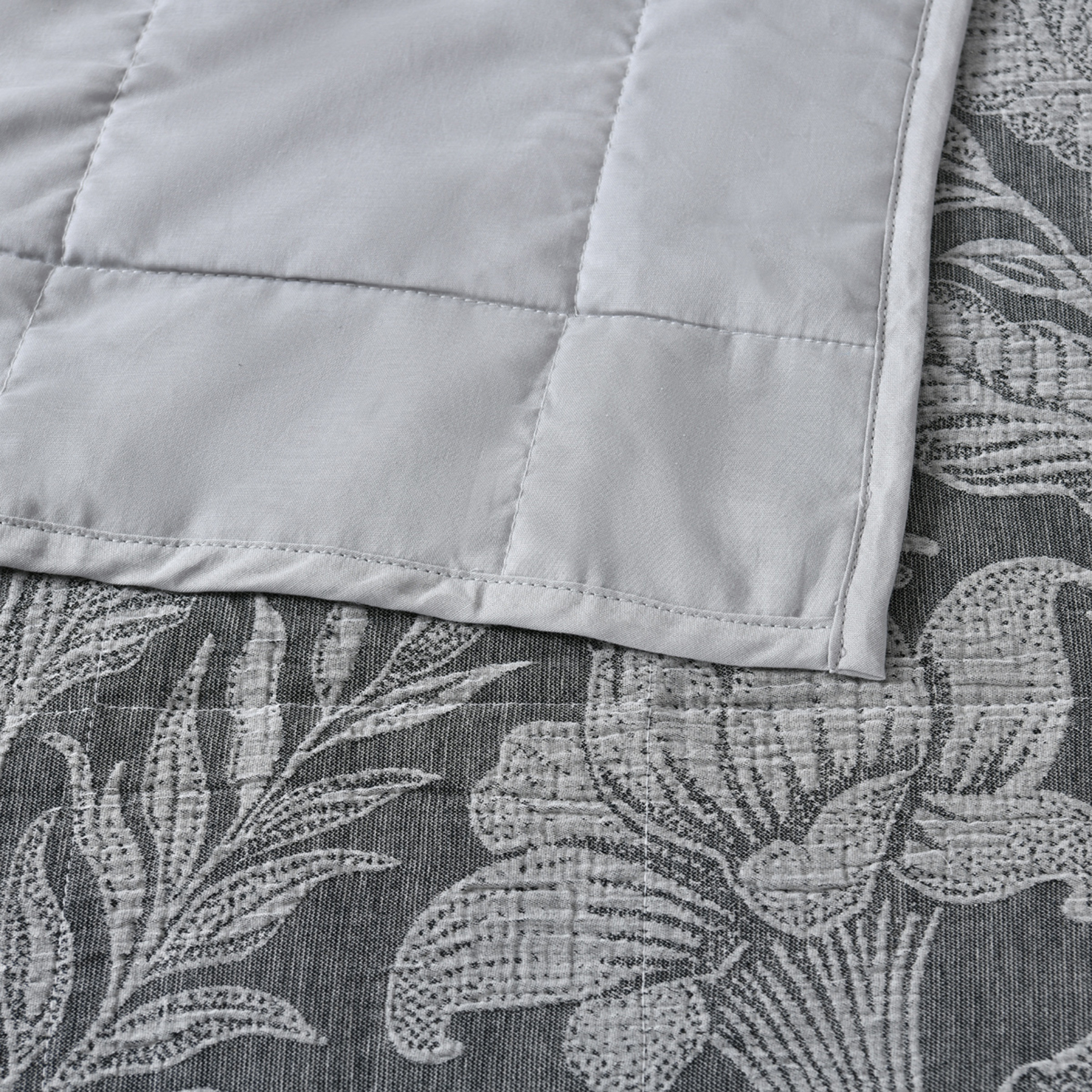 Refined florals with timeless texture. The Maidstone bedspread set features elegant light grey blooms set against a rich dark grey cotton jacquard. Thoughtfully finished with a tailored edge on the standard and European pillowcases, as well as the cushion it brings a polished, luxurious feel to your bedroom.