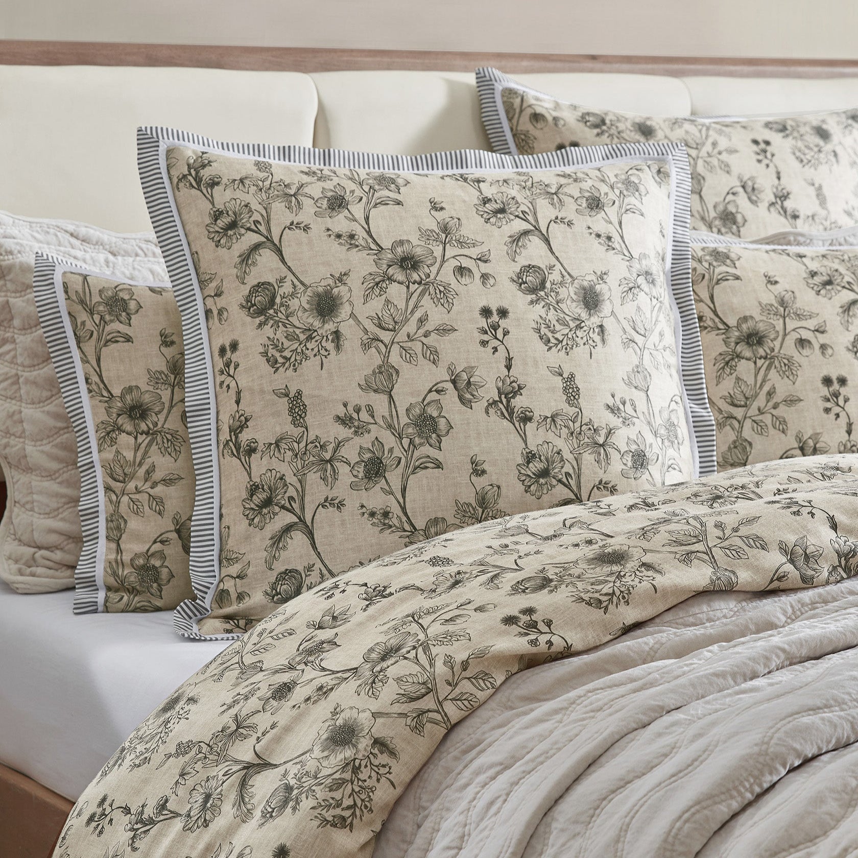 The Perpetua blends classic elegance with modern flair. Delicate hand-drawn florals on a printed linen-textured cotton sateen base, are framed by a tailored flange edge, with pinstripes and a crisp herringbone trim.
