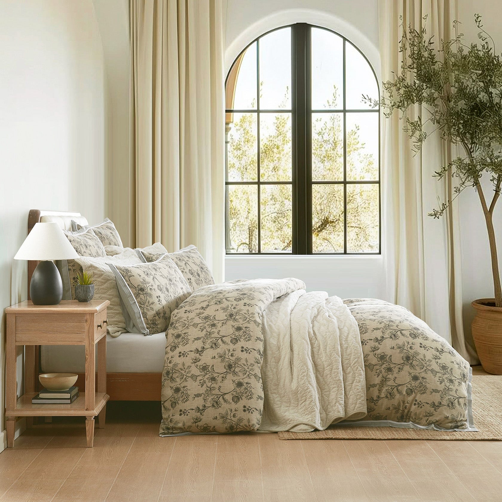 The Perpetua quilt cover set blends classic elegance with modern flair. Delicate hand-drawn florals on a printed linen-textured cotton sateen base, are framed by a tailored flange edge, with pinstripes and a crisp herringbone trim. Its reversible design features a grey and white stripe for versatility, making it a sophisticated statement piece for contemporary interiors.
