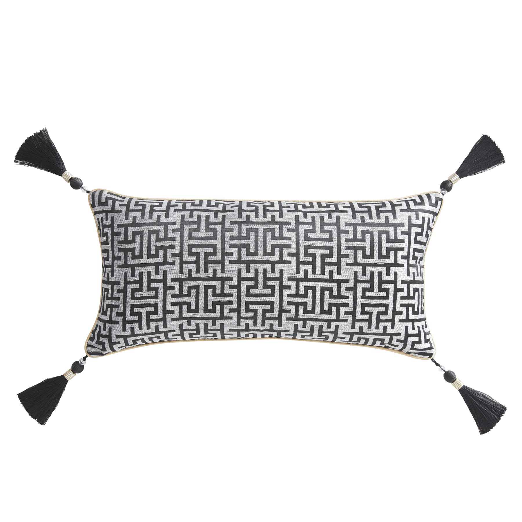 Elevate your bedroom with Tywin deluxe accessories in striking black, featuring an attached flange showcasing a sophisticated geometric key pattern border. It is framed with gleaming gold piping, it exudes opulence and modern elegance. The co ordinating accessories feature the geometric key pattern all over and tailored gold cord piping. Perfectly designed for style and comfort, this premium piece adds a touch of luxury to your space, making it a centrepiece of refinement.