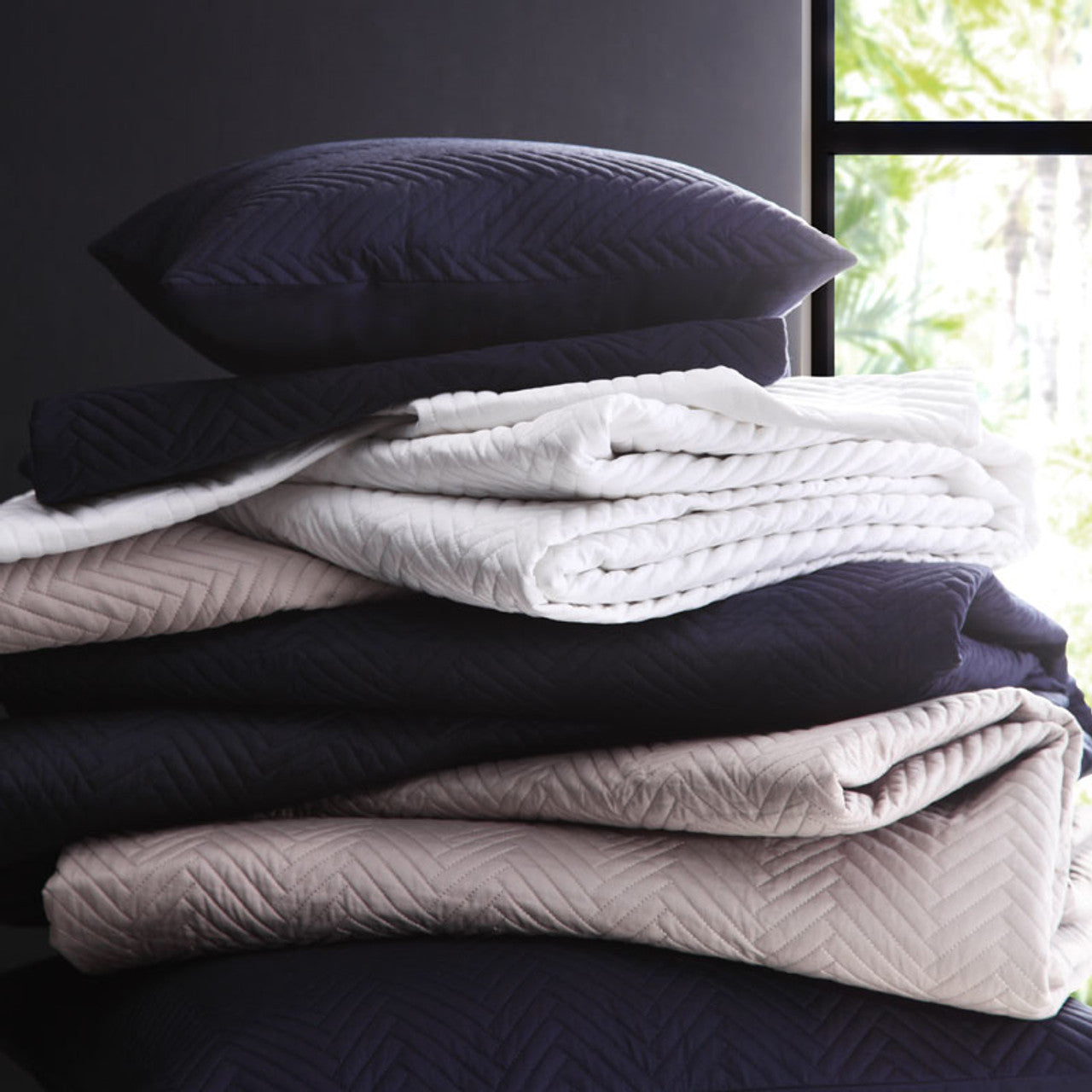 Westcott silver quilted filled long cushions are an essential part of your styling. The chevron pattern is both a trend and a tradition; a bold and beautiful design element. Use as a complement to your bed linen or as a sophisticated look on its own, these accessories have wonderful aesthetic appeal that will never go out of style. The range includes a European pillowcase, long cushion, pillow sham and coverlet in three versatile colours – navy, silver and white.